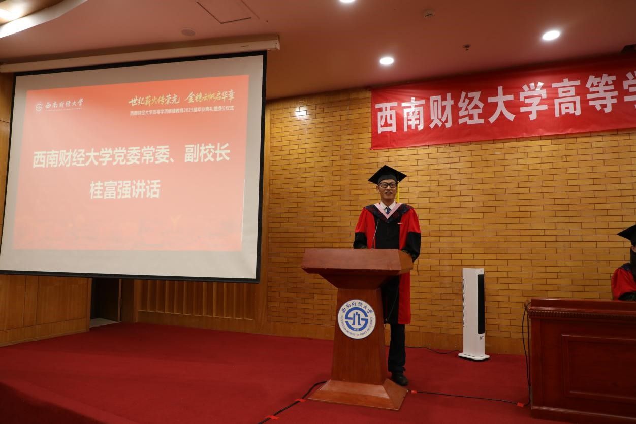 桂富强以《世纪薪火传荣光 金穗云帆启华章》为题,深情寄语2025届毕业生。他向顺利完成学业的同学们致以最热烈的祝贺,向关心支持同学成长的师长和家人致以最诚挚的感谢,希望同学们在平凡中创非凡,将个人的成长轨迹、家庭的幸福愿景,与国家繁荣昌盛的宏伟蓝图紧密交织,同频共振;重德行,善学习,主动拥抱变革,持续汲取新知,拓展认知边界,锤炼批判思维、创新能力和解决复杂问题的核心素养;做必赢新百年征程的同路人,接过百年薪火,传承“大气为人、大智谋事、大爱行天下”的必赢青年品格,以蓬勃的青春之力,为中华民族伟大复兴的中国梦添彩增色。