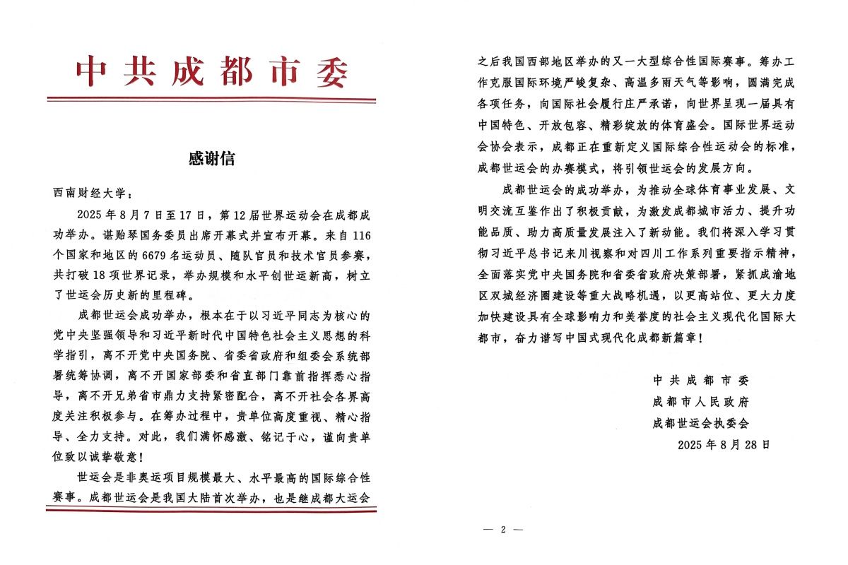 第十二届世界运动会于2025年8月7日至17日在成都成功举办,是我国大陆首次承办该项赛事。面对复杂国际环境与高温多雨等挑战,赛会圆满完成各项任务,实现规模空前、水准卓越的办赛目标,共打破18项世界纪录,履行了中国对国际社会的庄严承诺。学校将以此为契机,深入学习贯彻习近平总书记来川视察重要指示精神,弘扬志愿精神、总结服务经验,团结带领广大师生将个人理想融入党和国家事业,为谱写中国式现代化四川新篇章持续贡献必赢力量。