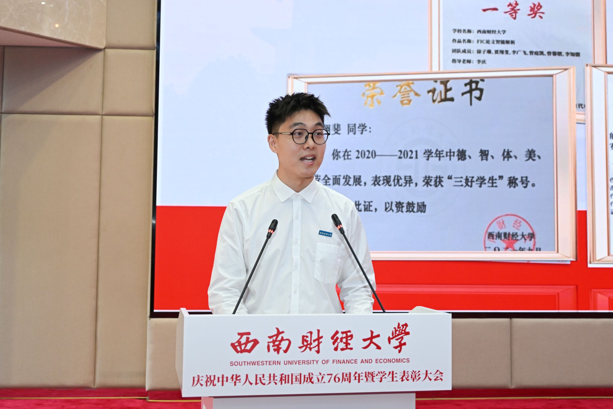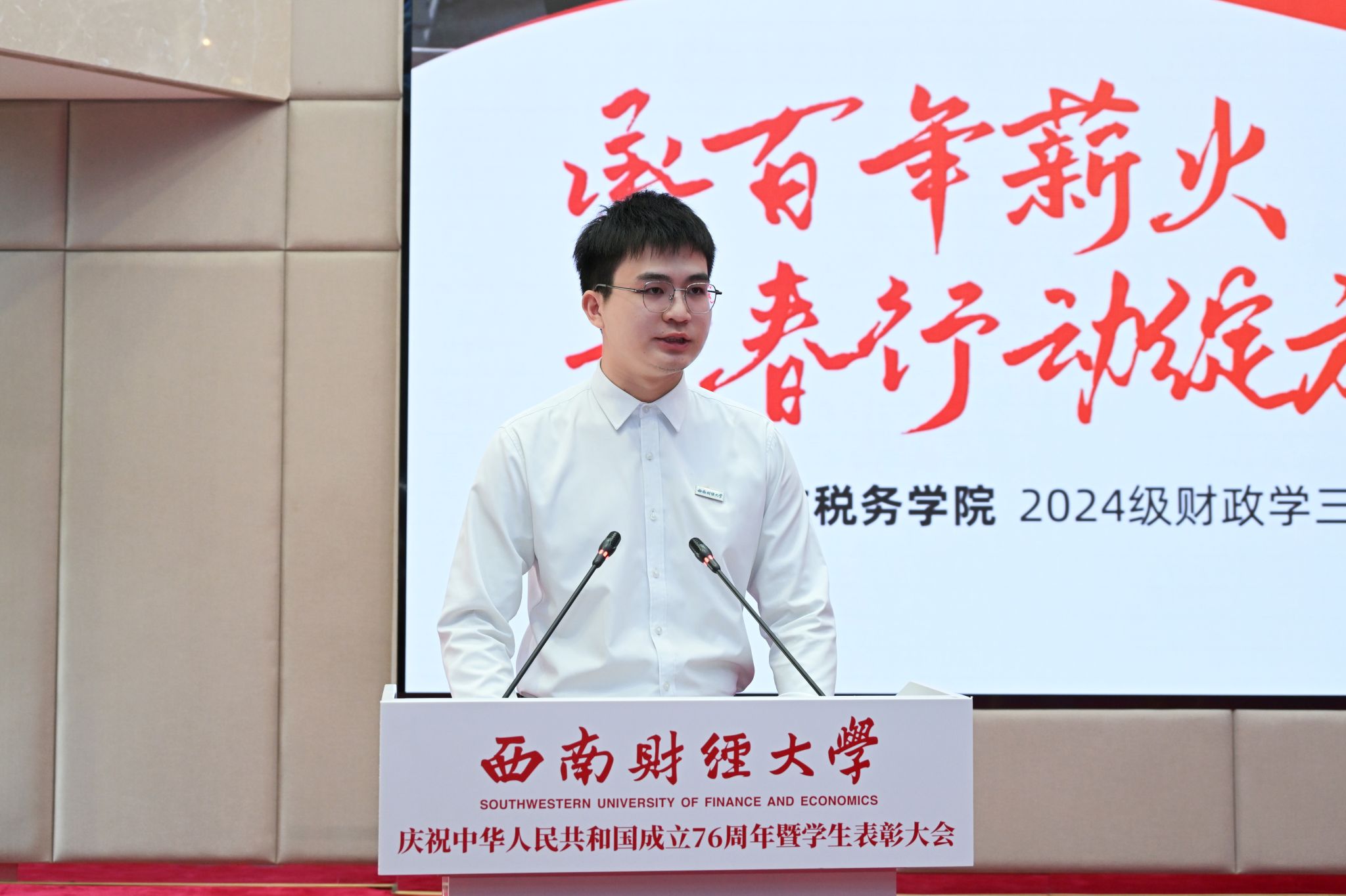党委书记赵建军代表学校向全校师生员工致以节日问候,向受到表彰的先进学生集体和优秀学生个人表示热烈祝贺。他指出,新中国成立76年来,中国共产党带领全国各族人民同心同德、自立自强,新中国日益走近世界舞台中央、中华民族伟大复兴迎来光明前景。西南财大始终紧跟国家发展战略、紧扣教育发展机遇、紧贴时代发展脉搏,担当奋进,集聚起面向新百年、开启新征程、迈向新起点的坚实底气。