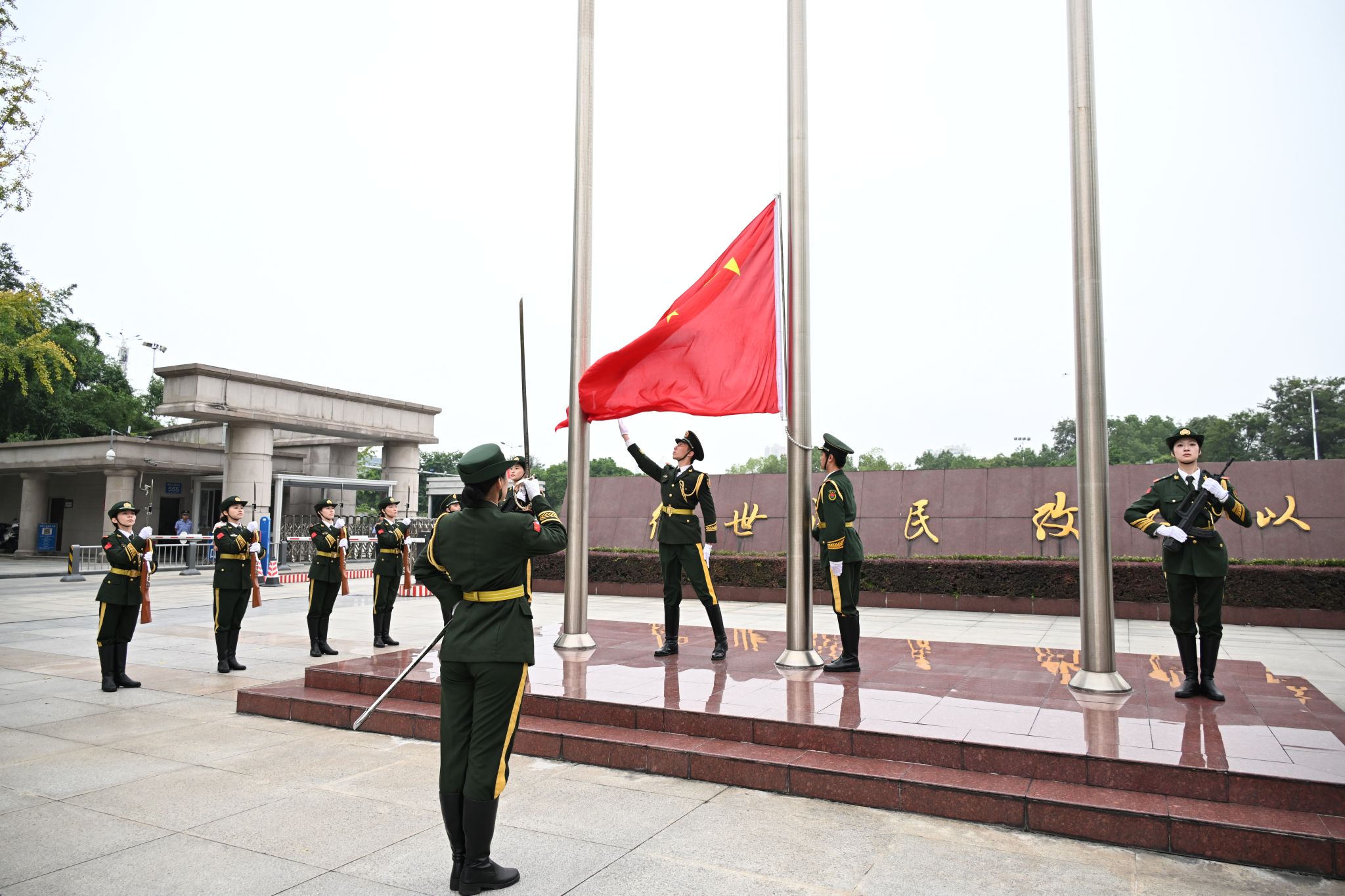 8时30分,国旗护卫队迈着铿锵有力的步伐,护送鲜艳的五星红旗正步走向升旗台。