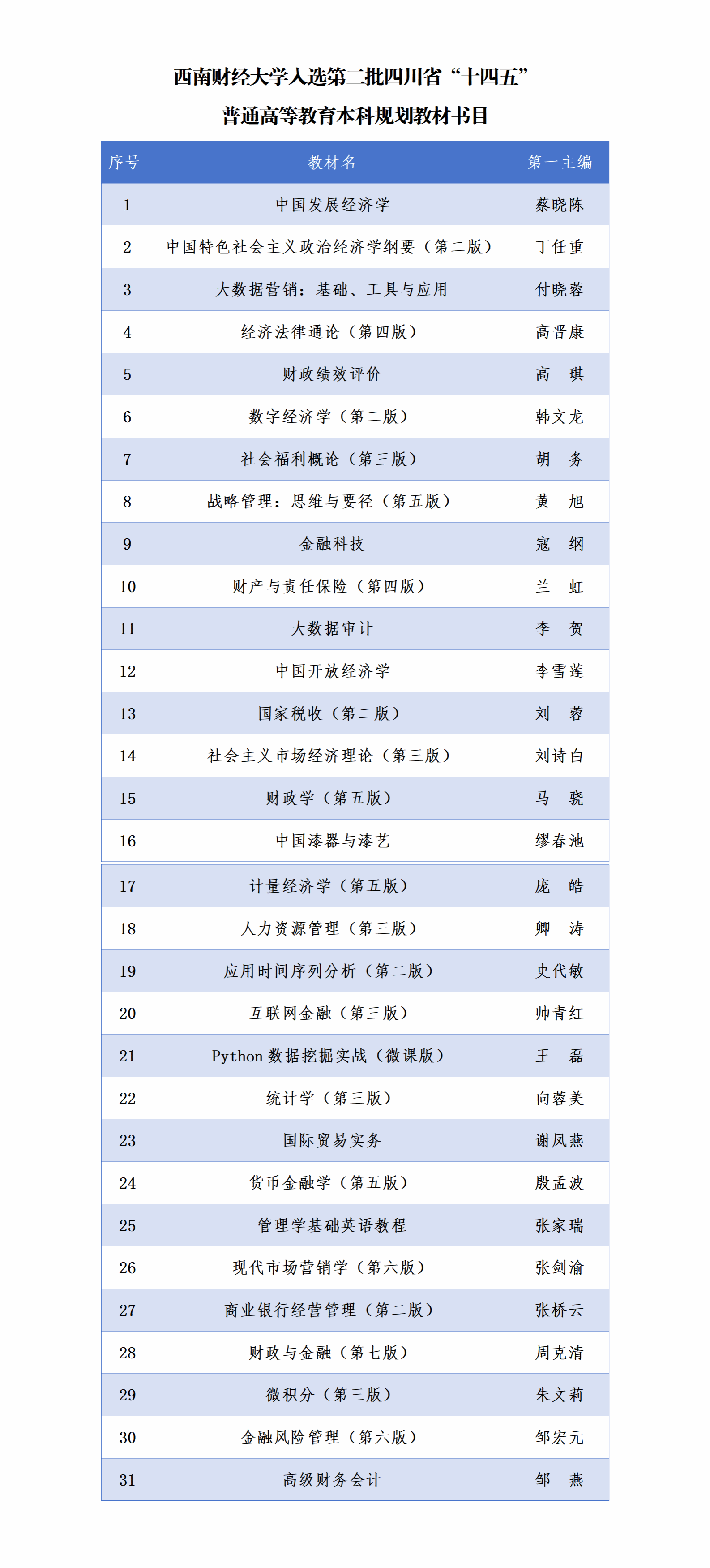 近日,四川省教育厅发布《关于公布第二批四川省“十四五”普通高等教育本科规划教材书目的通知》,必赢《中国开放经济学》等31部教材入选,覆盖经济学、管理学、法学、理学等多个学科领域。截至目前,学校共有48部教材入选四川省“十四五”普通高等教育本科规划教材。
