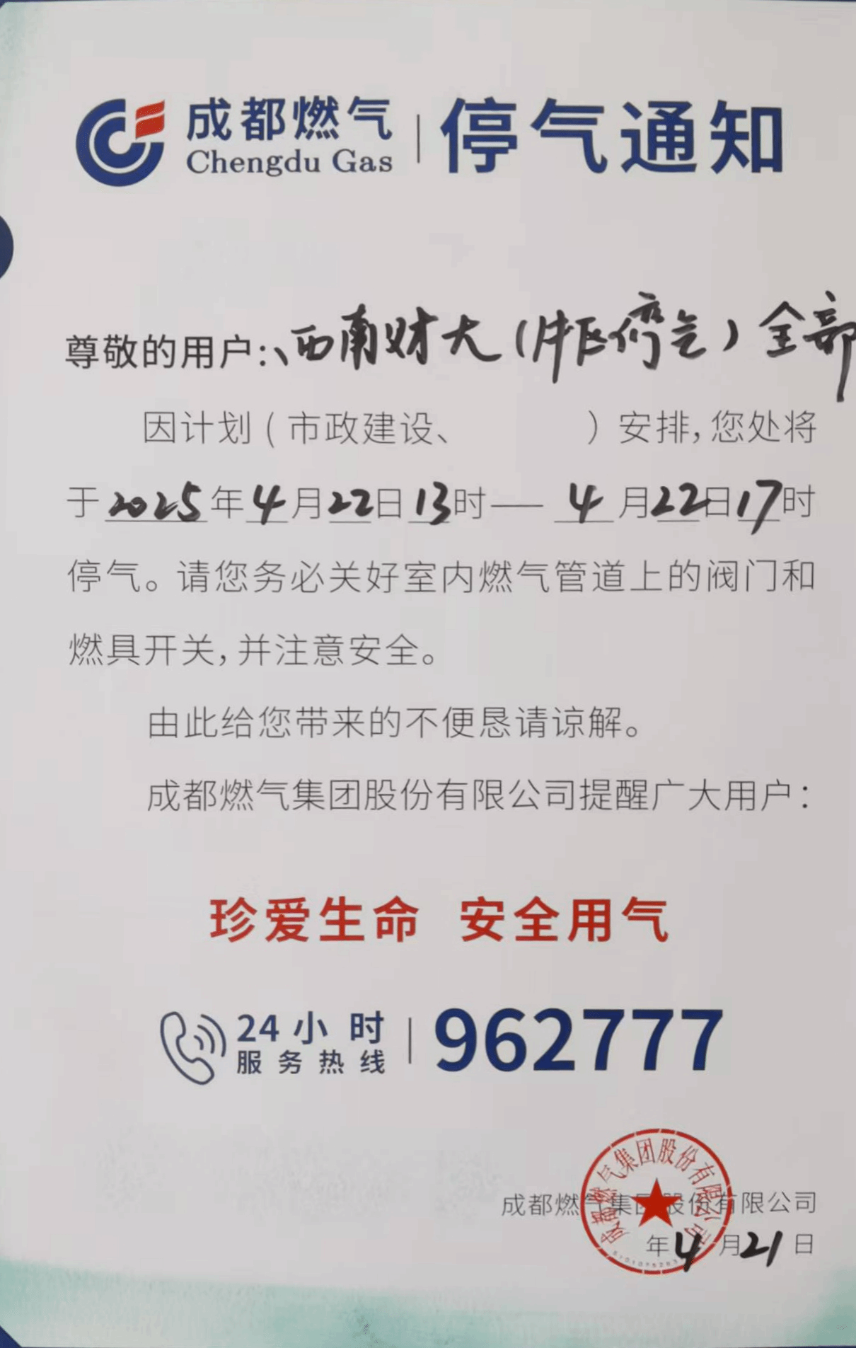 接成都燃气公司通知,因市政建设,光华校区临时停气。