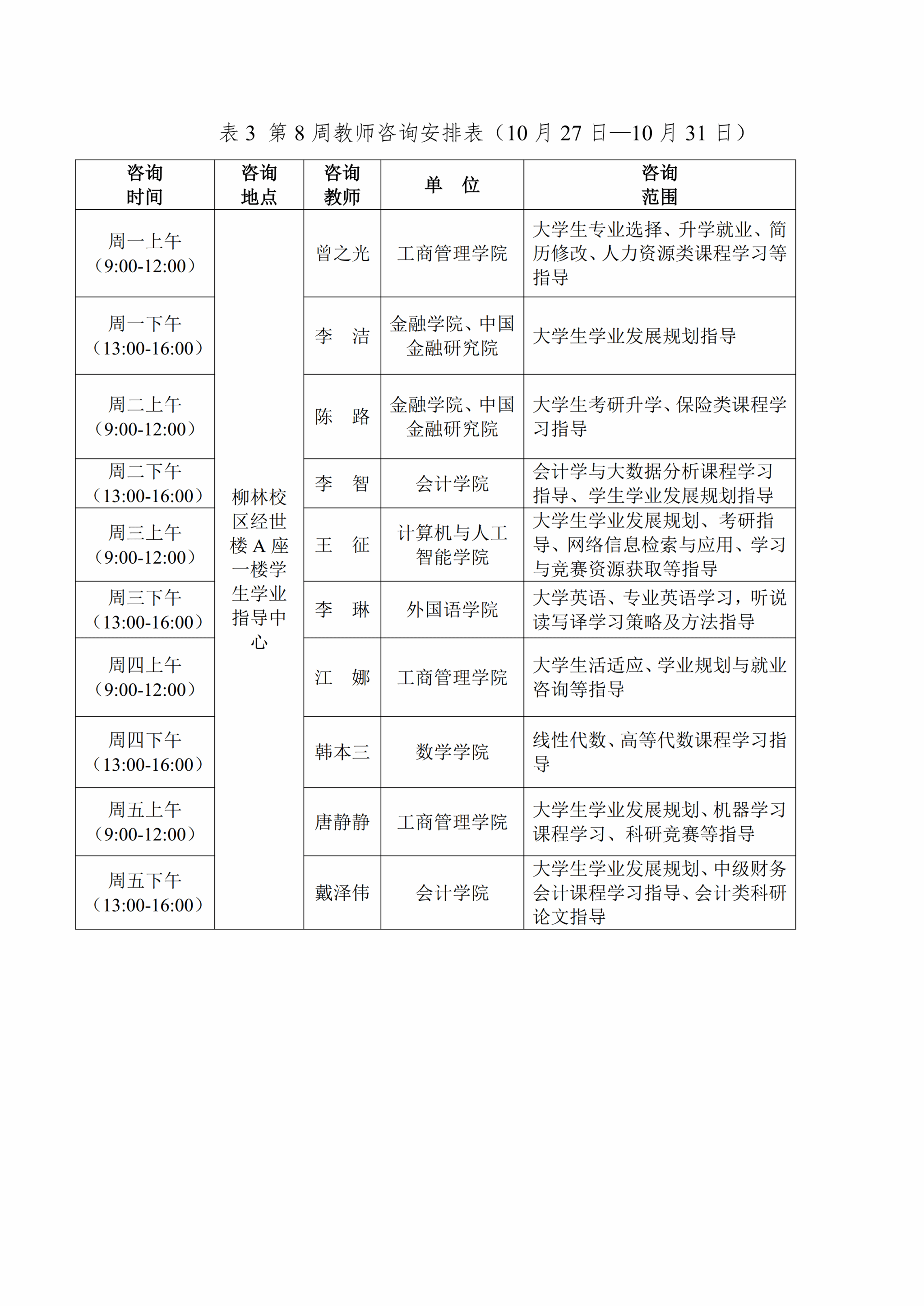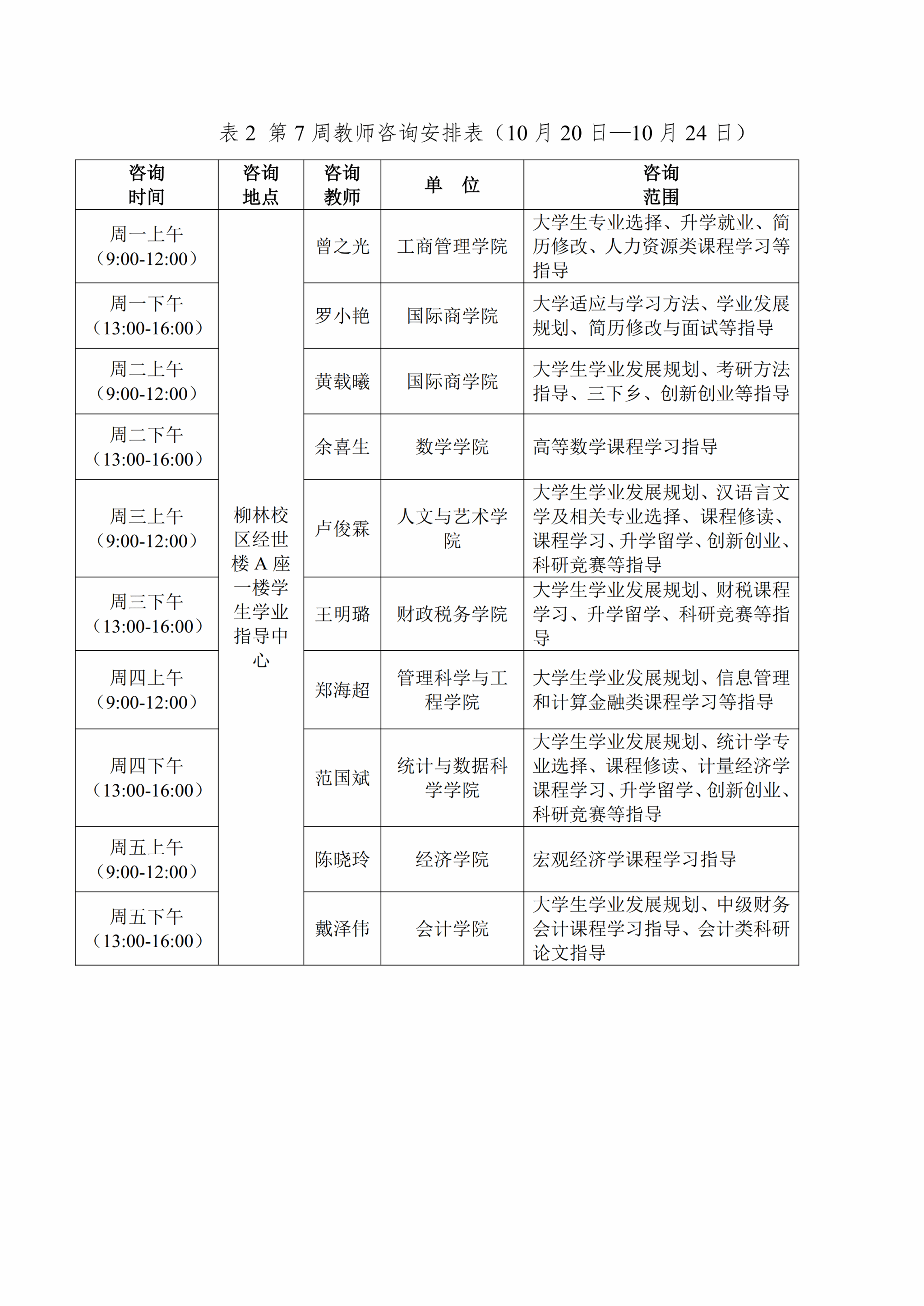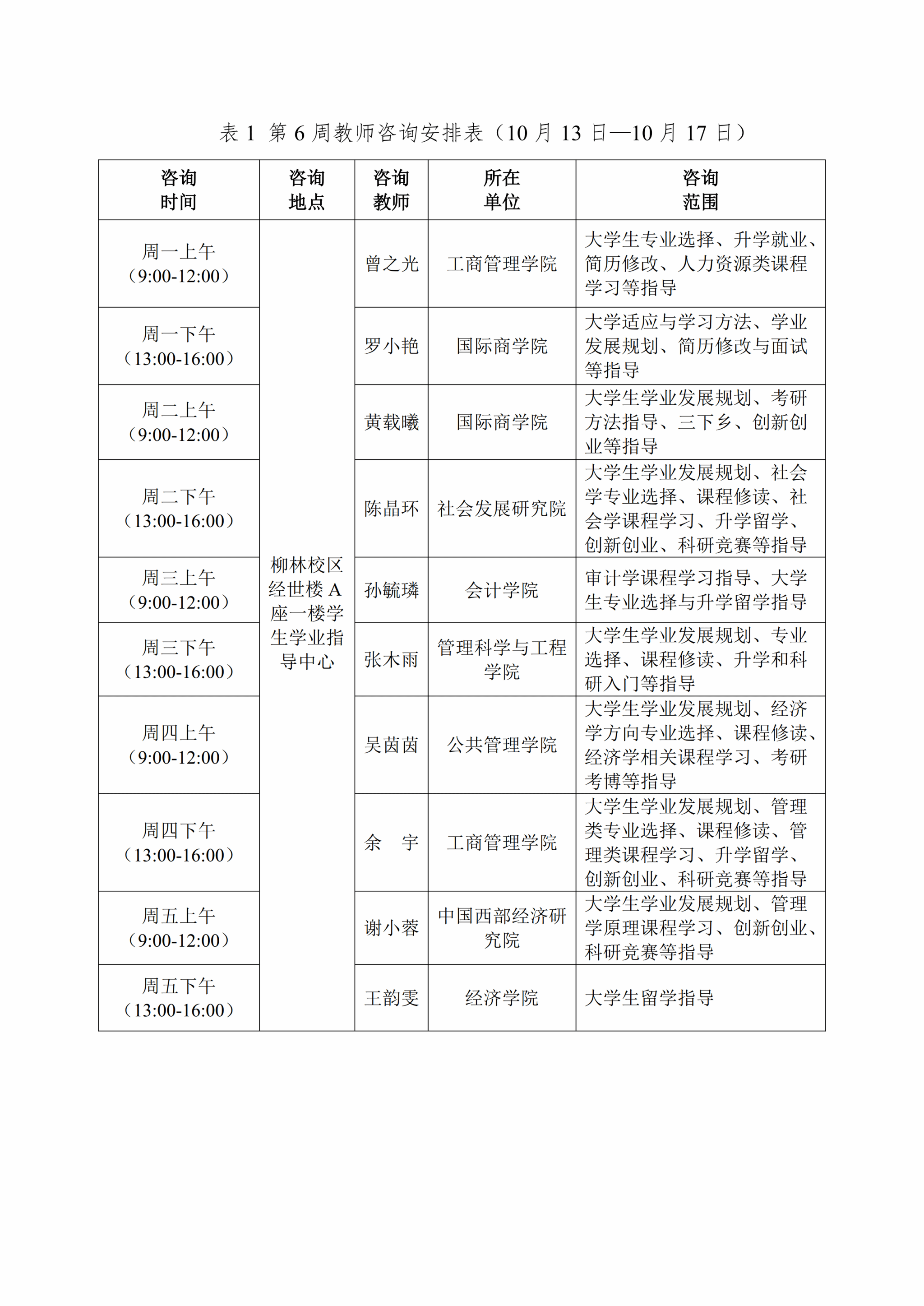 为推进课程教学范式深彻转变,促进同学们学习理念、习惯、方式与时俱进,丰富大家在校学习体验,提供学业规划、学科内容、学业流程等方面的咨询答疑,现将本学期第6至9周(10月13日—11月7日)教师咨询安排通知如下:
