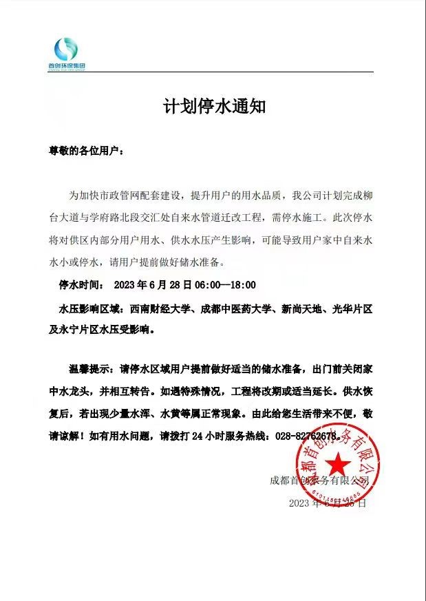接自来水公司通知,6月28日(星期三)6:00—18:00自来水市政主管迁改工程施工,届时柳林校区水压将受到影响,高楼层可能出现停水现象。