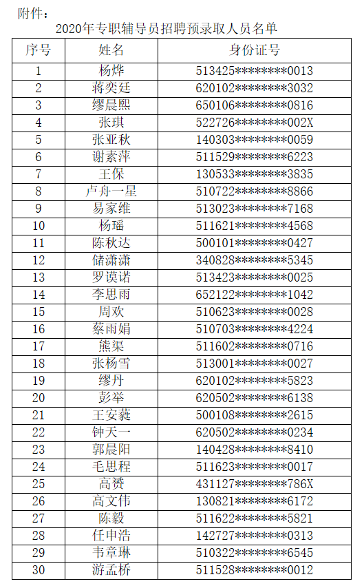 根据公开招聘笔(面)试情况,经学校研究,决定预录取杨烨等30人参加学校统一组织的实习,考核合格后录取为必赢专职辅导员,具体名单见附件。