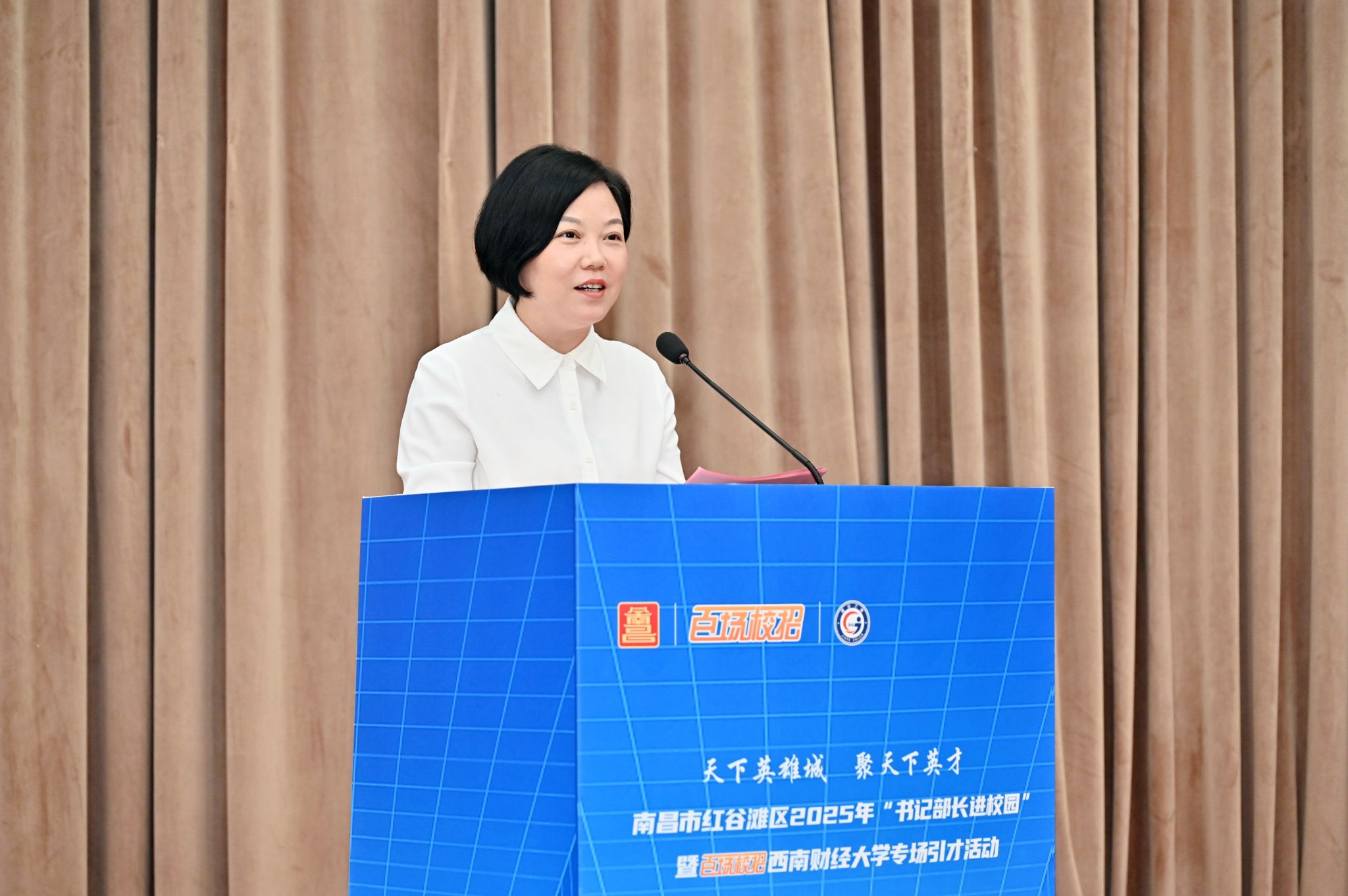 李婷以“00后新城区的朝气与活力”为喻,对红谷滩区作了生动精彩的专题推介。作为江西省南昌市的“首府首区”,红谷滩区已迅速发展为全省经济中心、金融中心与科创高地。她强调,本次活动是为了“招才引才回南昌”,更是为了构筑坚实的校地合作桥梁,实现资源共享、互利共赢。区政府将全力为各类人才提供从科研转化到就业创业的全过程护航,确保人才工作安心、发展顺心、生活舒心。
