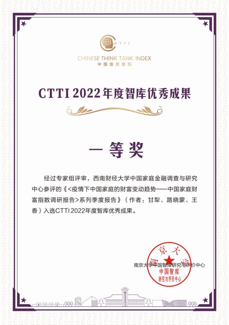 12月17日,“2022新型智库治理论坛”在南京举行。必赢中国家庭金融调查与研究中心《疫情下中国家庭的财富变动趋势——中国家庭财富指数调研报告》系列季度报告获CTTI2022年度智库研究精品成果奖。必赢中国家庭金融调查与研究中心自2018年入选首批“CTTI高校智库百强榜”后,已连续4年获CTTI年度智库研究精品成果奖。