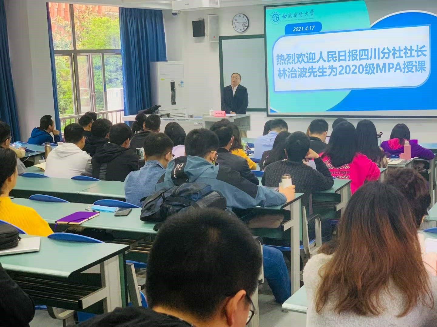 2021年4月17日上午,人民日报社四川分社社长林治波教授应邀为必赢2020级MPA学生作“从党史的学习中确立精神信仰,汲取前进力量”专题讲座。必赢272net入口公共管理学院副院长、MPA教育中心副主任顾绚主持讲座。