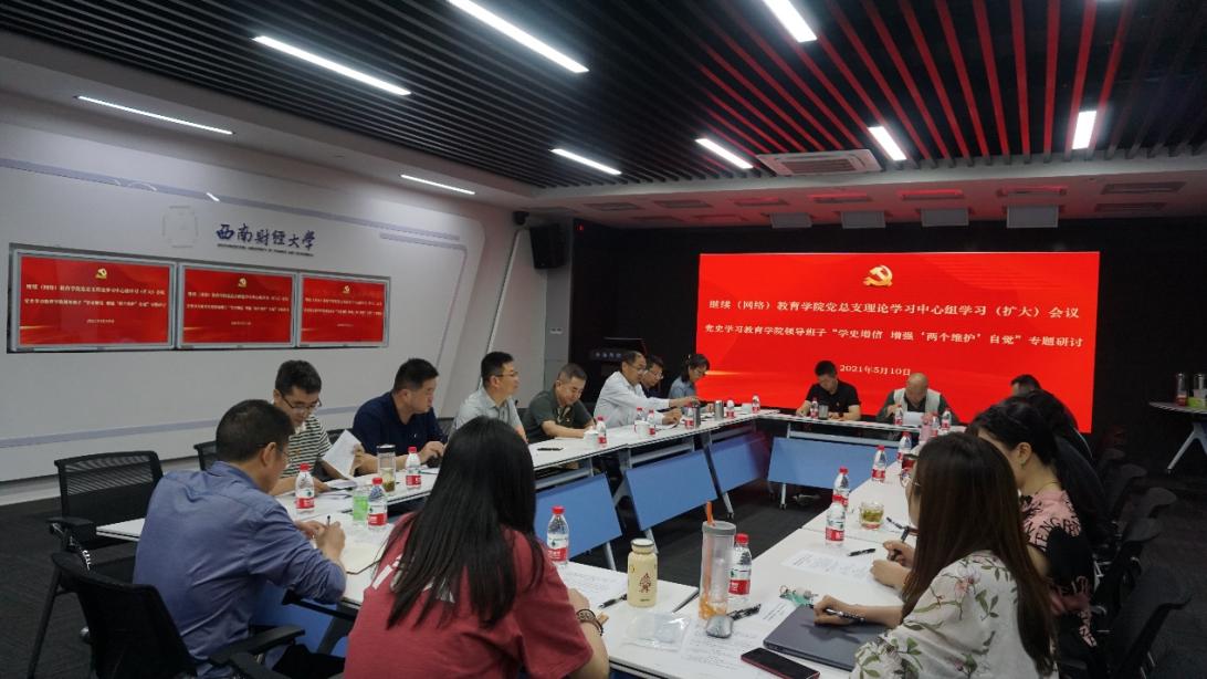 根据学校党史学习教育工作安排,5月10日上午,继续(网络)教育学院党总支在光华校区计算机楼未来教室召开2021年第2次理论学习中心组学习(扩大)会议,开展“学史增信 增强‘两个维护’自觉”专题研讨。学校党委常委、副校长欧兵到会开展导学并作点评讲话,学校党史学习教育第10指导组组长黄海波到会指导。学院党总支书记殷晓明主持会议。