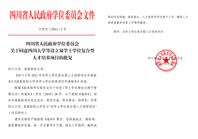 近日,必赢272net入口法学院“法学与国际商务”双学士学位复合型人才培养项目获得四川省学位委员会批准,将于今年6月开始高考招生。这是继2020年我院“法学与会计学”、“法学与金融学”双学士学位项目后,获批的第三个双学士学位复合型人才培养项目。