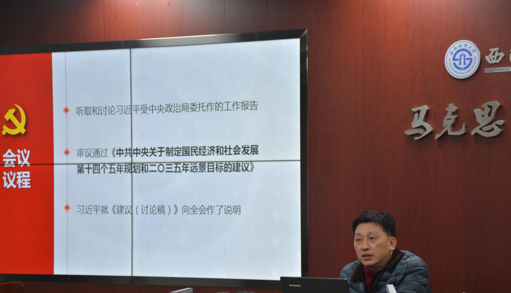 2020年12月15日,马克思主义学院在通博楼A117召开政治理论学习会,四川省委宣讲团成员、马克思主义学院院长唐晓勇宣讲党的十九届五中全会精神。会议由学院党总支书记雷栋良主持,全体教职工参加会议。
