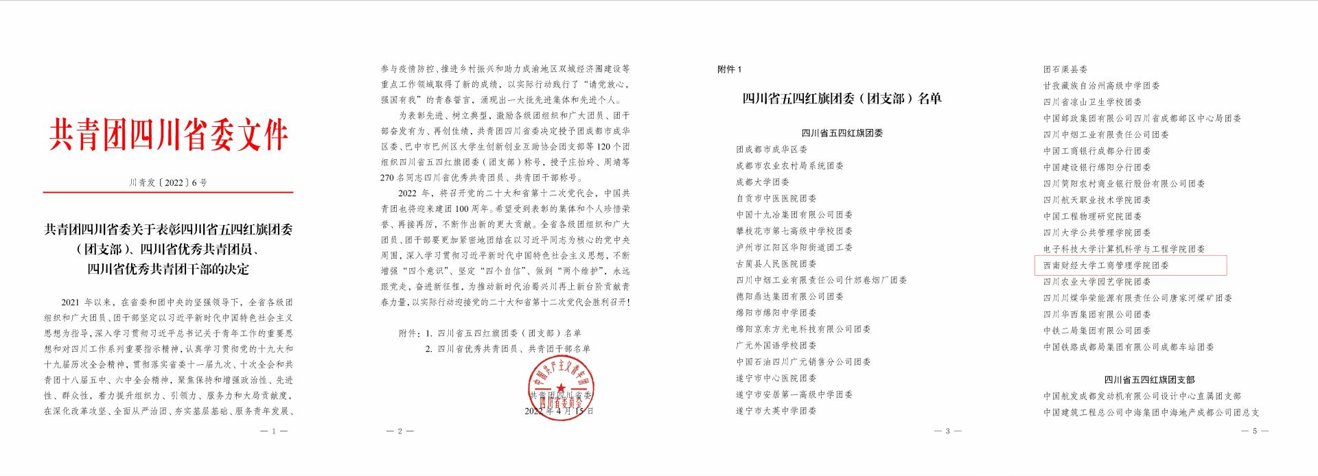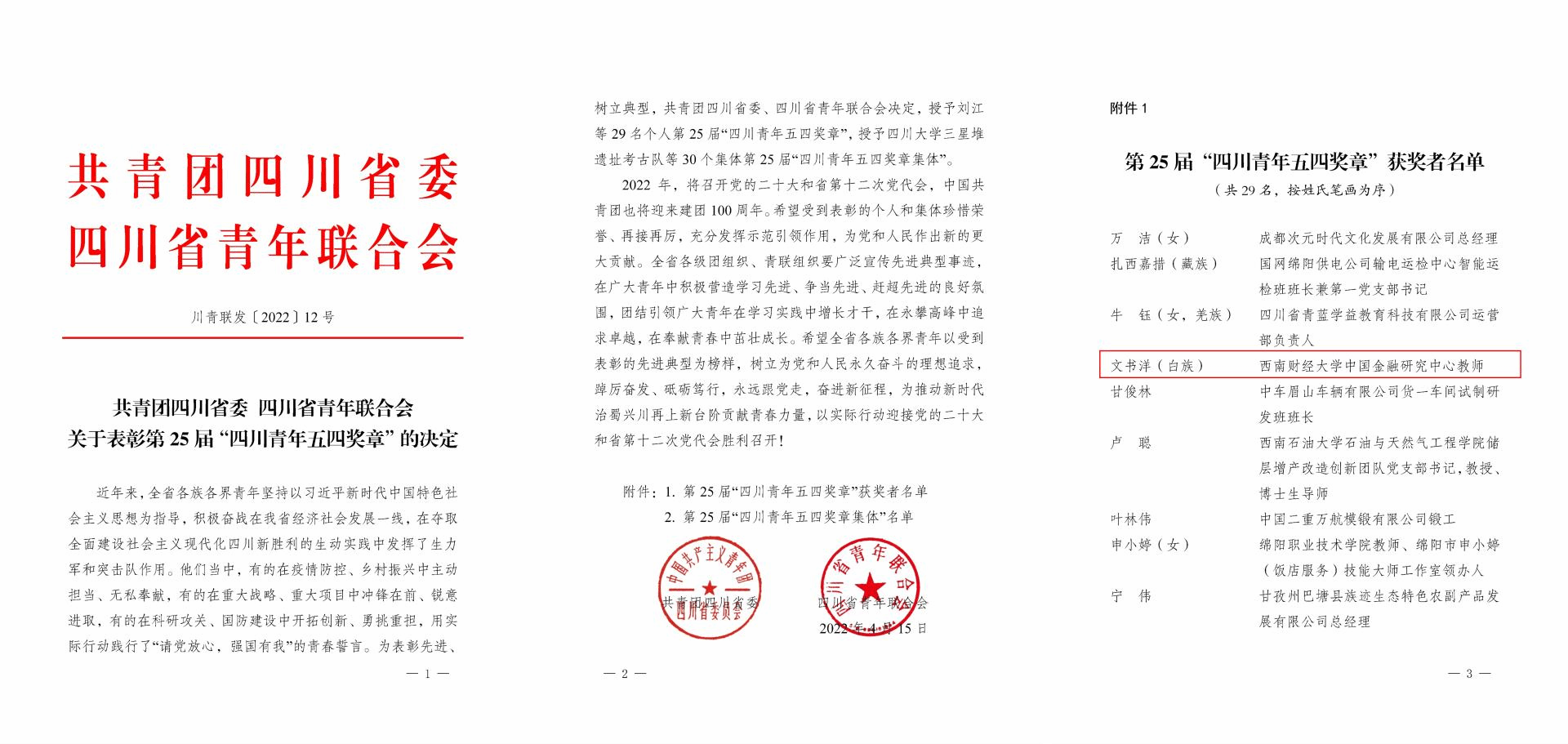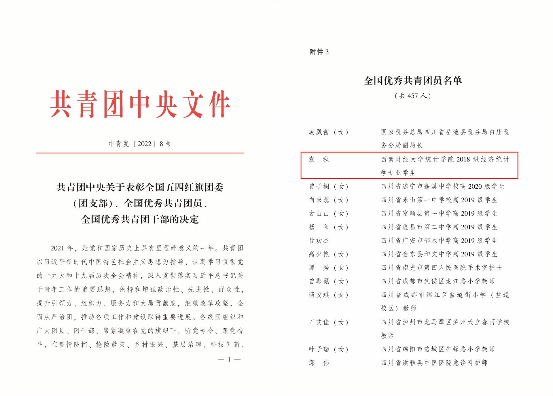 五四前夕,共青团中央印发关于表彰全国五四红旗团委(团支部)、全国优秀共青团员、全国优秀共青团干部的决定,共青团四川省委、四川省青年联合会印发关于表彰第25届“四川青年五四奖章”的决定,共青团四川省委印发关于表彰省五四红旗团委(团支部)、省优秀共青团员、省优秀共青团干部的决定,必赢统计学院2018级经济统计专业袁秋同学荣获“全国优秀共青团员”,中国金融研究中心教师文书洋被授予第25届“四川青年五四奖章”,工商管理学院团委荣获“四川省五四红旗团委”。