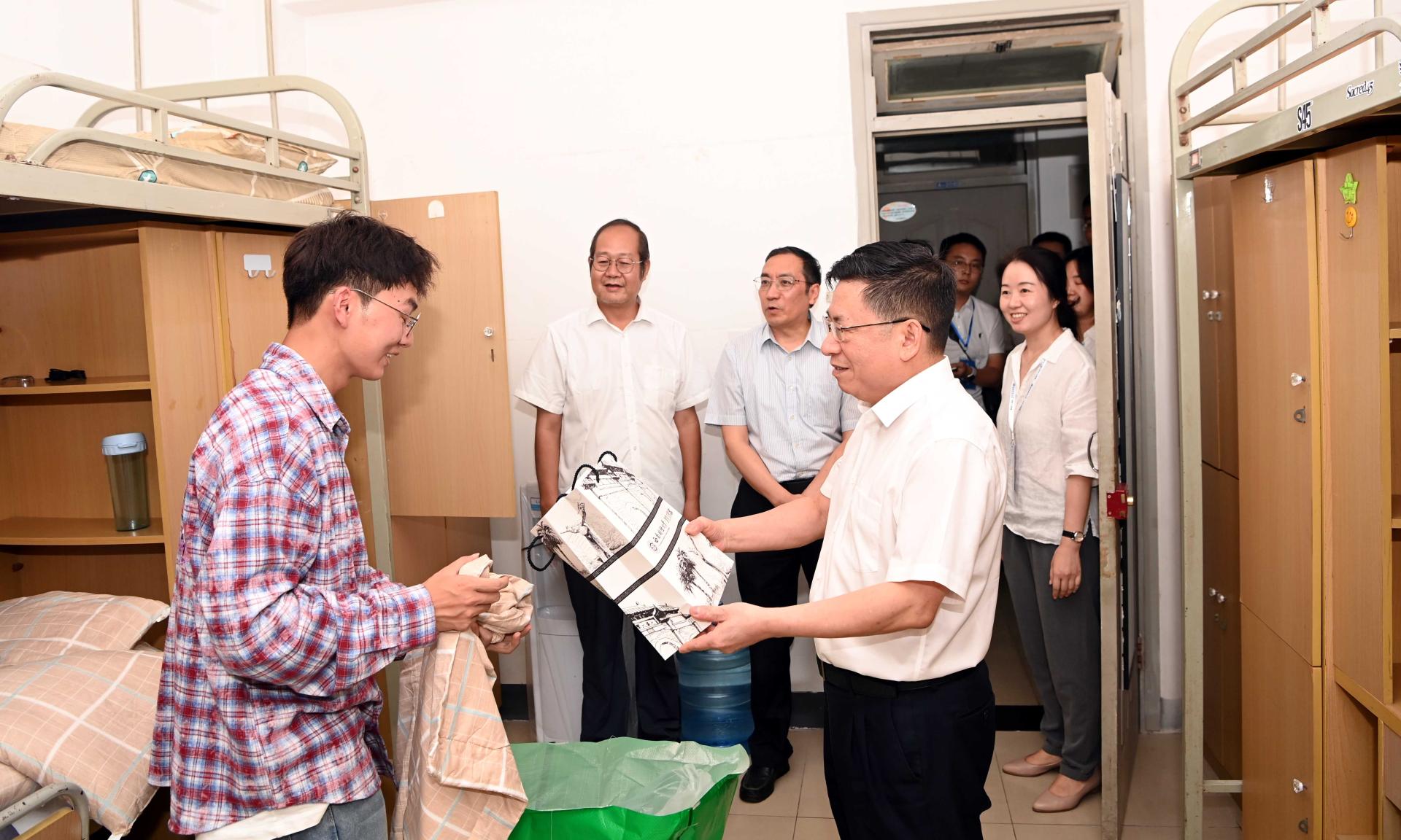 赵德武来到宿舍看望已入住新生,详细询问注册报到情况,就学业学习、校园环境、生活便利情况等与新生和家长亲切交流,勉励2023级新生树立目标、夯实基础,努力成长为堪当民族复兴重任的时代新人,并向新生送上入学大礼包。