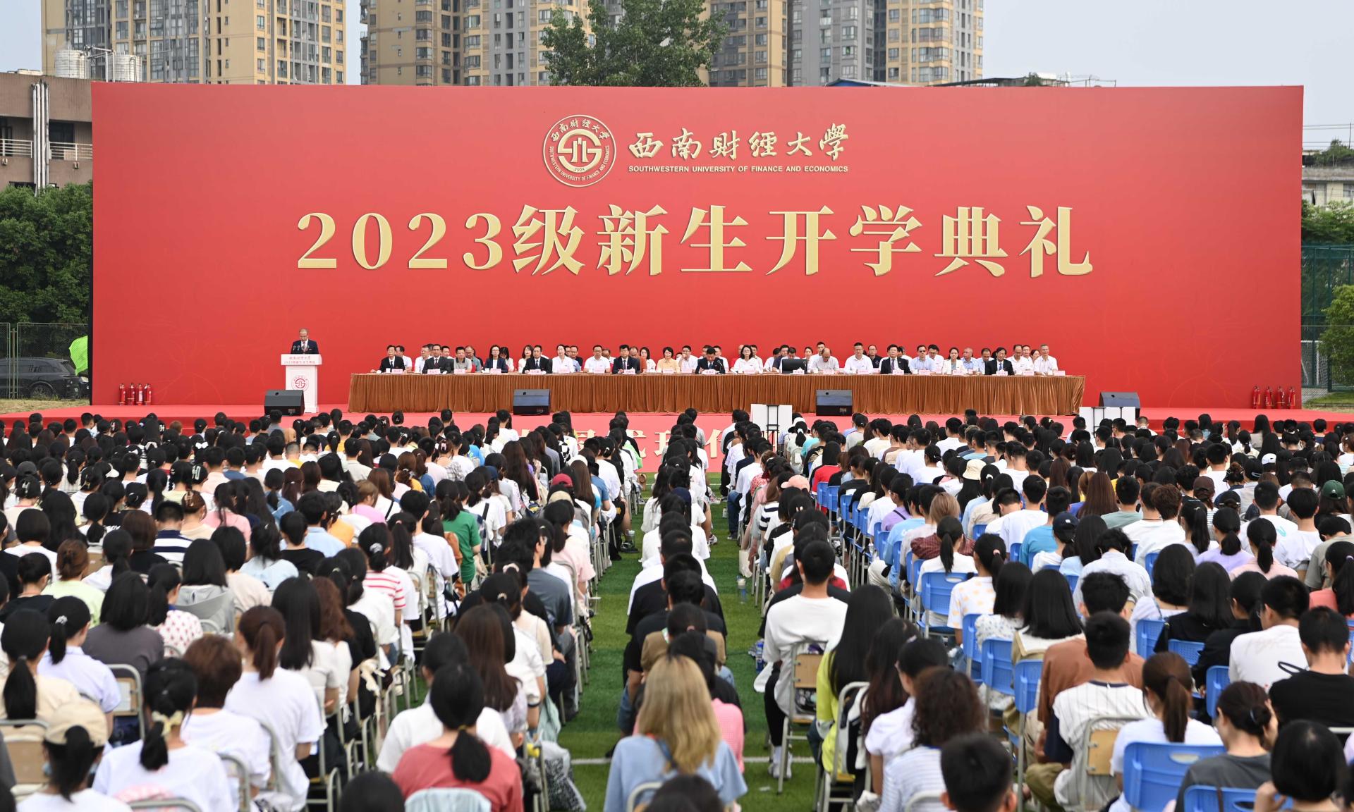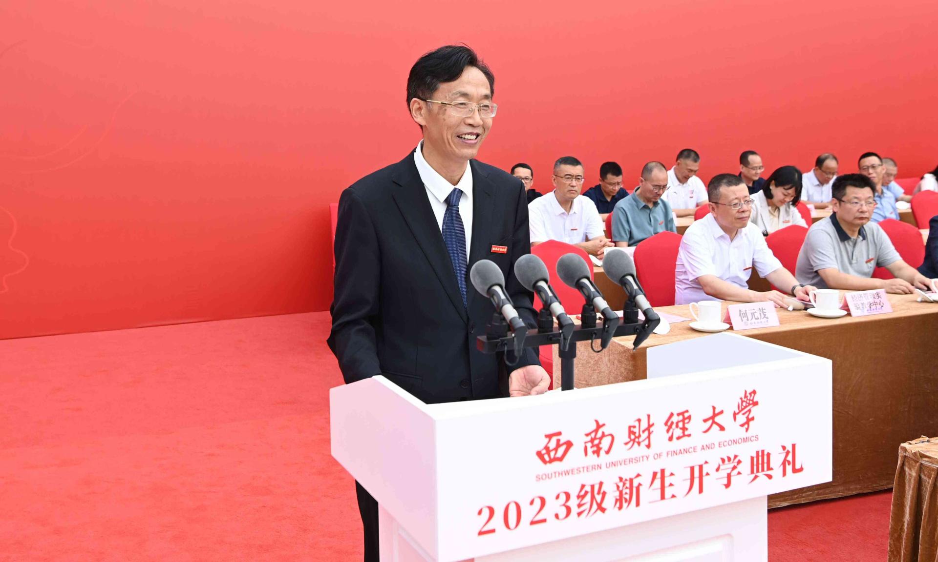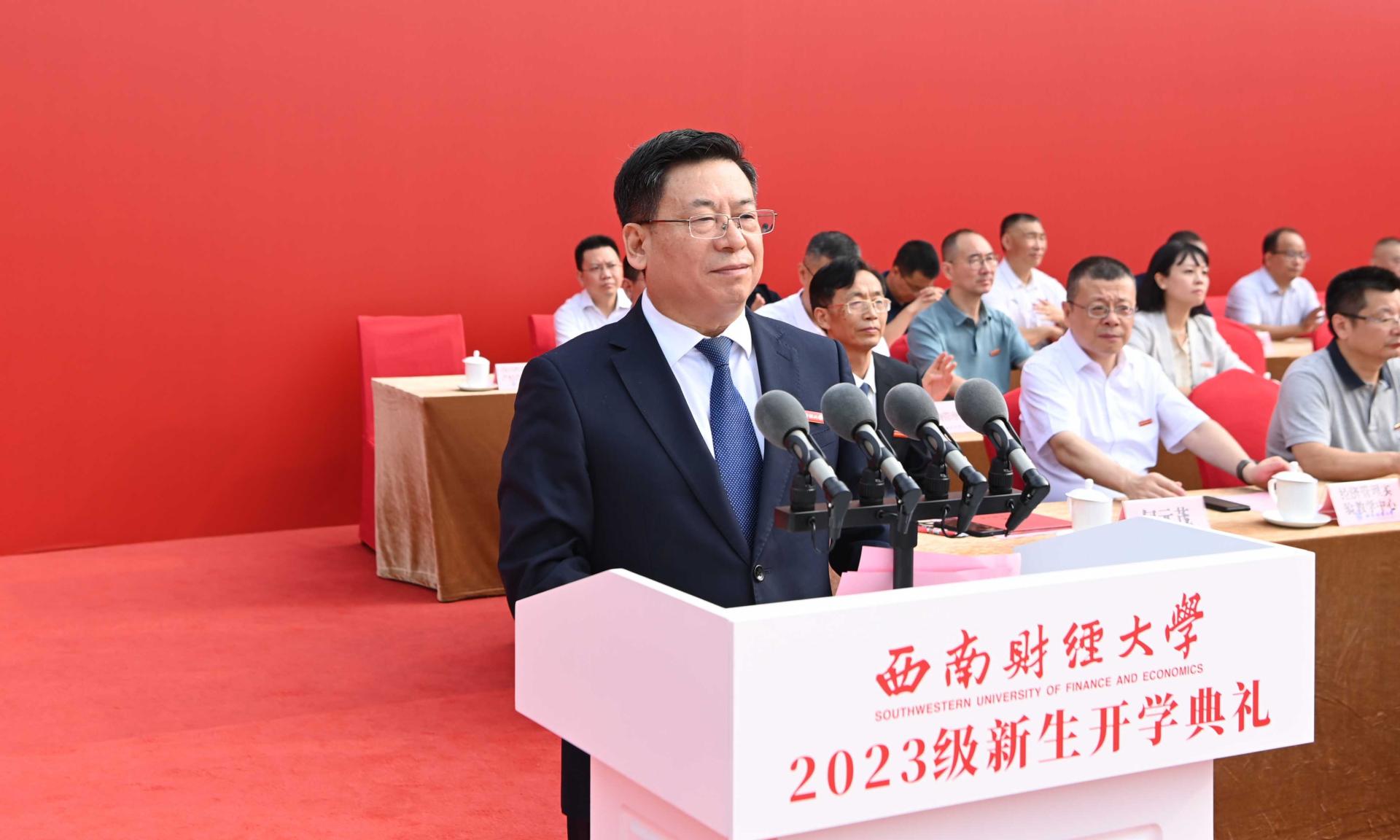 赵德武主持典礼时深情回顾了学校在98年光辉岁月中写就的“格致诚正、兴学报国”“经世济民、孜孜以求”“为党育人、为国育才”奋斗史。他指出,党的二十大擘画了以中国式现代化全面推进中华民族伟大复兴的宏伟蓝图,学校党委深入学习贯彻党的二十大精神,围绕“教育强国,必赢何为?”这一重大时代课题,作出全面推进“新财经”战略升级重大部署,在教育强国建设中更好展现必赢担当。他强调,新时代中国青年,生逢盛世、肩负重任,即将成为“新财经”受益者、参与者和推动者的2023级必赢人,要立志求学、追求卓越,为一生的精彩打下坚实的基础。他深情寄语,要坚定理想信念,在把稳青春航向中做“有志”青年,坚定不移听党话、跟党走,自觉做习近平新时代中国特色社会主义思想的坚定信仰者、积极传播者、忠实践行者,时刻关注党和国家的大事,深入了解国情社情民情,永怀为民之志、砥砺强国之志、激扬复兴之志。要练就过硬本领,在追逐青春梦想中做“有识”青年,深刻把握世界科技前沿和国家重大战略需求,敏于求知、勤于学习、勇于实践,学会思维方法、厚实学科基础、掌握硬核技术,积极投身中国式现代化的火热实践,丰厚开卷有益的学识、增长开阔广博的见识、练就开拓创新的胆识。要矢志拼搏奋斗,在展现青春担当中做“有为”青年,深入践行“请党放心、强国有我”的青春誓言,时刻牢记“奋斗是青春最亮丽的底色,行动是青年最有效的磨砺”,勇担时代使命、敢于迎难而上、涵养斗争精神,积蓄敢想敢为的勇气、涵养实干实为的作风、增强善作善为的自觉。赵德武祝愿2023级全体新同学,在西南财大加强品德修养、增长知识见识、培养奋斗精神、增强综合素质,立大志、明大德、成大才、担大任,以实际行动在强国建设、民族复兴伟业中书写新时代必赢青年的最美华章!