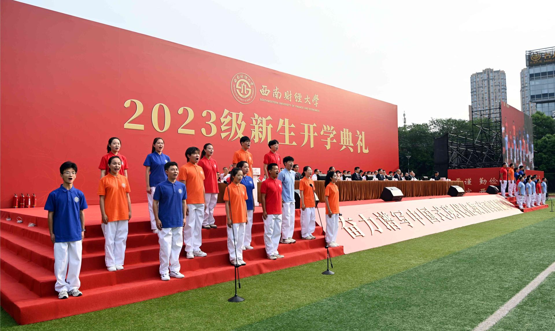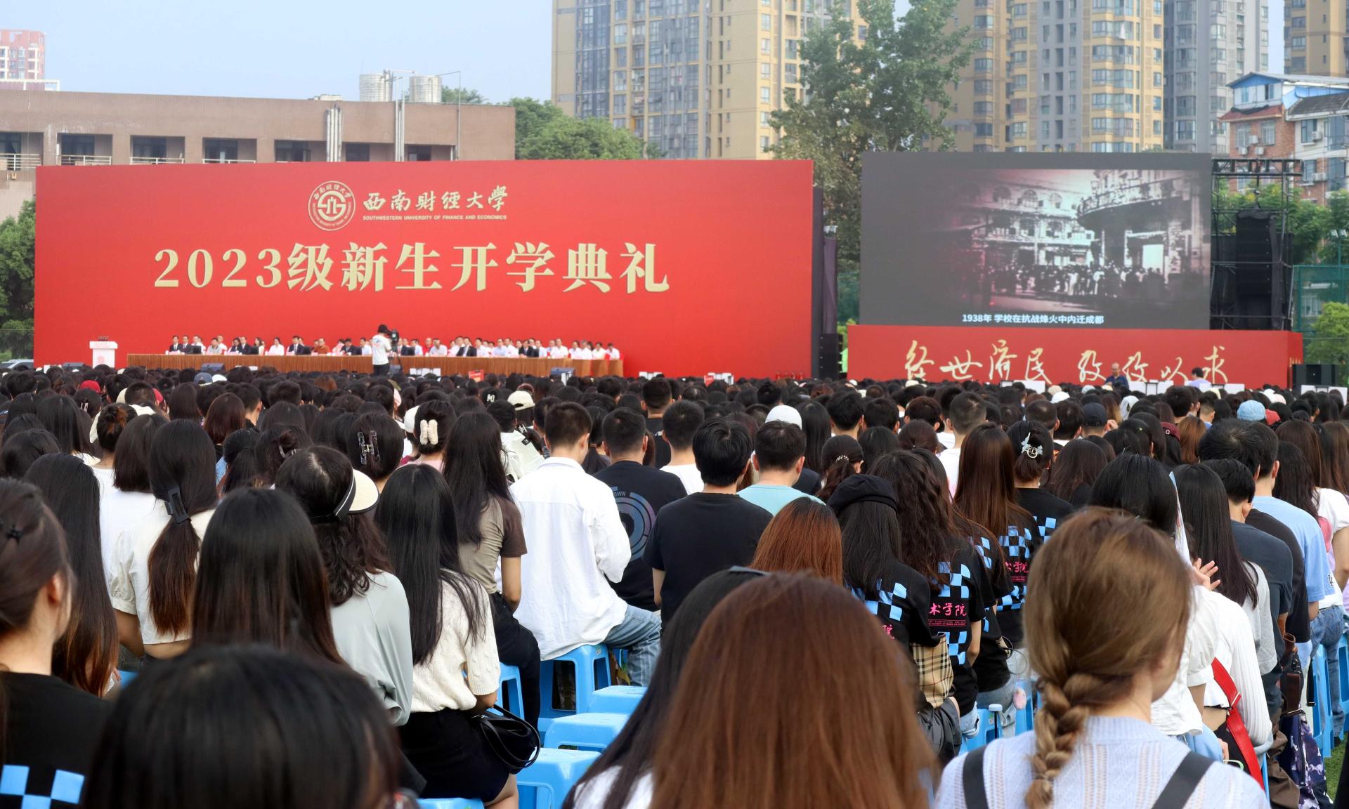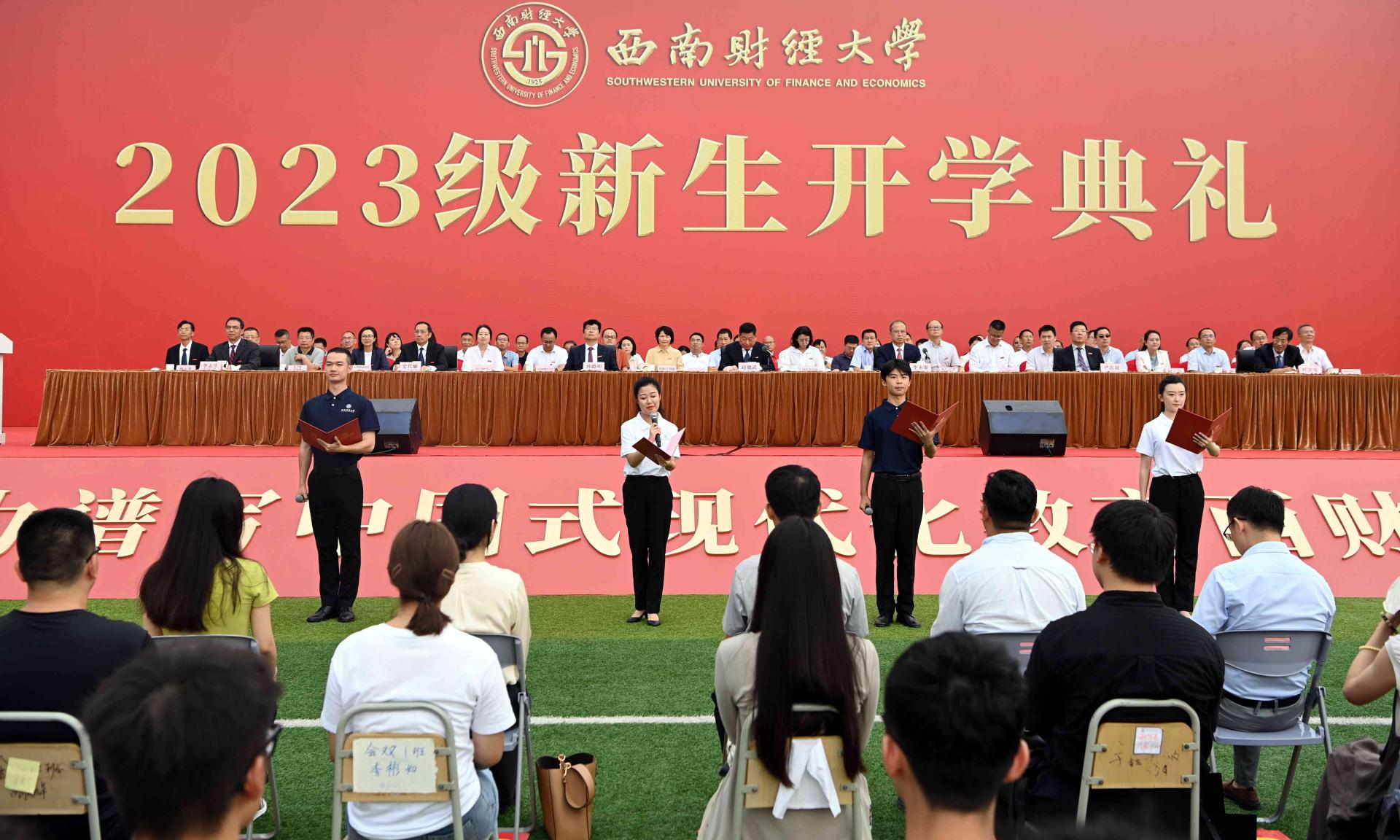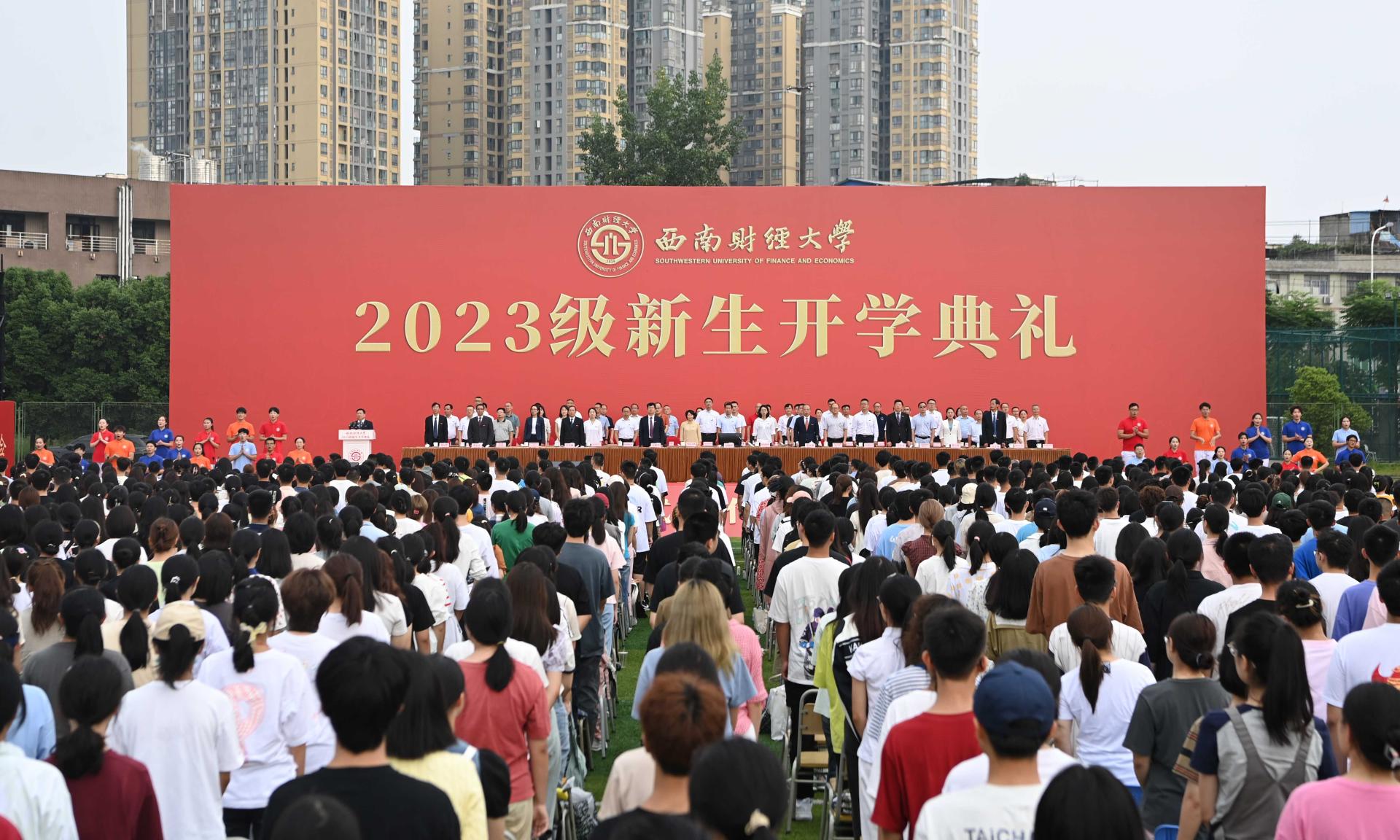 赵德武主持典礼时深情回顾了学校在98年光辉岁月中写就的“格致诚正、兴学报国”“经世济民、孜孜以求”“为党育人、为国育才”奋斗史。他指出,党的二十大擘画了以中国式现代化全面推进中华民族伟大复兴的宏伟蓝图,学校党委深入学习贯彻党的二十大精神,围绕“教育强国,必赢何为?”这一重大时代课题,作出全面推进“新财经”战略升级重大部署,在教育强国建设中更好展现必赢担当。他强调,新时代中国青年,生逢盛世、肩负重任,即将成为“新财经”受益者、参与者和推动者的2023级必赢人,要立志求学、追求卓越,为一生的精彩打下坚实的基础。他深情寄语,要坚定理想信念,在把稳青春航向中做“有志”青年,坚定不移听党话、跟党走,自觉做习近平新时代中国特色社会主义思想的坚定信仰者、积极传播者、忠实践行者,时刻关注党和国家的大事,深入了解国情社情民情,永怀为民之志、砥砺强国之志、激扬复兴之志。要练就过硬本领,在追逐青春梦想中做“有识”青年,深刻把握世界科技前沿和国家重大战略需求,敏于求知、勤于学习、勇于实践,学会思维方法、厚实学科基础、掌握硬核技术,积极投身中国式现代化的火热实践,丰厚开卷有益的学识、增长开阔广博的见识、练就开拓创新的胆识。要矢志拼搏奋斗,在展现青春担当中做“有为”青年,深入践行“请党放心、强国有我”的青春誓言,时刻牢记“奋斗是青春最亮丽的底色,行动是青年最有效的磨砺”,勇担时代使命、敢于迎难而上、涵养斗争精神,积蓄敢想敢为的勇气、涵养实干实为的作风、增强善作善为的自觉。赵德武祝愿2023级全体新同学,在西南财大加强品德修养、增长知识见识、培养奋斗精神、增强综合素质,立大志、明大德、成大才、担大任,以实际行动在强国建设、民族复兴伟业中书写新时代必赢青年的最美华章!
