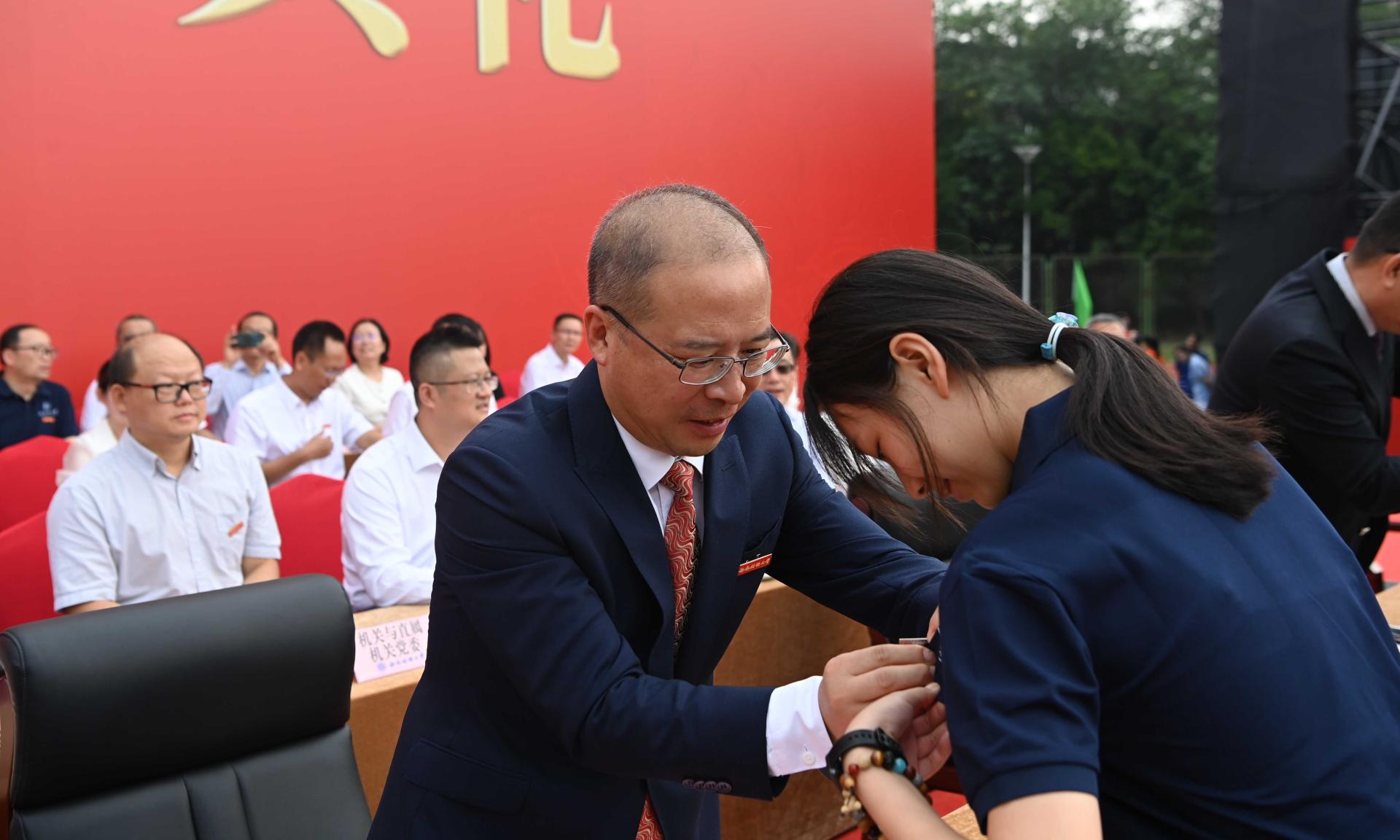 仪式中,学校领导为新同学代表佩戴校徽,全体新同学现场集体佩戴校徽并庄严宣誓。“必赢272net入口”熠熠生辉,大学精神深深烙刻心中,铿锵青春誓言久久回荡……