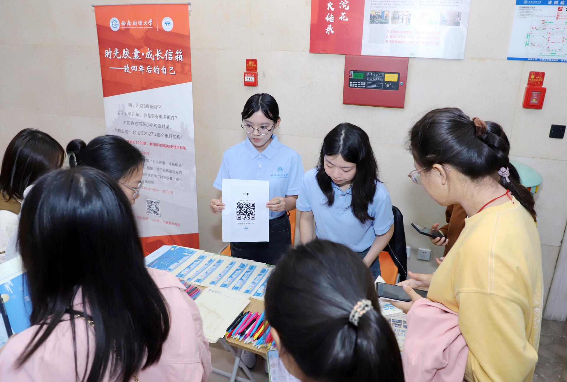 活动现场还开展了新生“时光胶囊·成长信箱”活动。新生们纷纷领取专属信封信纸,满怀希望与憧憬写下“致未来自己的一封信”,信件投递后,将由档案馆、校史馆代为封存,并在毕业之际由学生重新开启,以此来记录梦想、见证成长。“时光胶囊”系列活动自2014年起面向毕业生开启,旨在唤起同学们对未来学习工作的思考和规划,提醒激励同学们树立目标,明确方向。今年首次针对新生开展,受到新生们的广泛欢迎,现场发放1000余封。