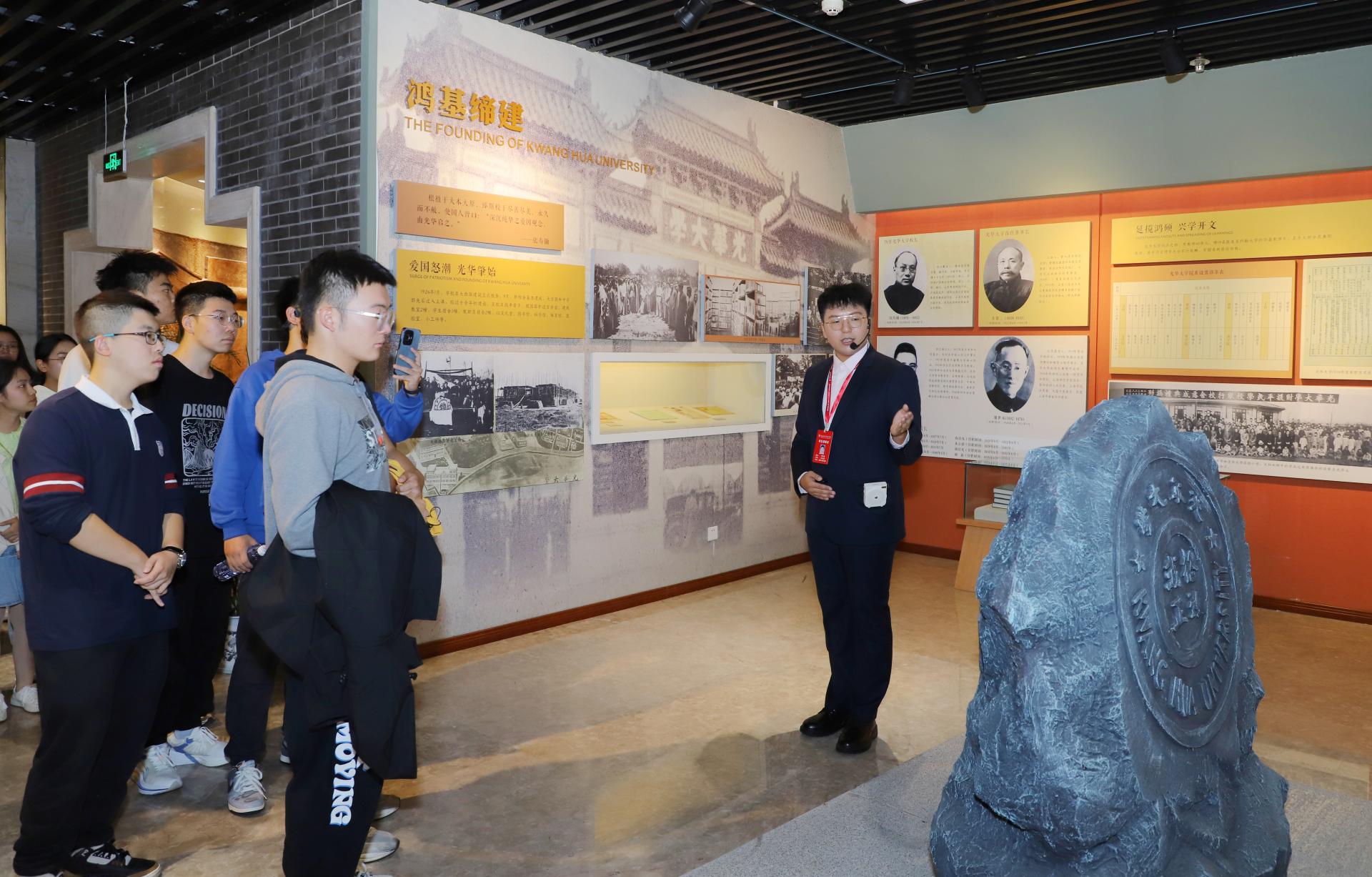 校史馆共分序厅、日月光华、丹心铁卷、鲲激鹏举、云帆远济和专题展区六个展区,展示了学校与国家民族共命运、与时代发展同进步的辉煌历程。在学生讲解员的精彩解说中,2023级新生学习了学校在98年光辉岁月中写就的“格致诚正、兴学报国”的奋斗历史和精彩故事。