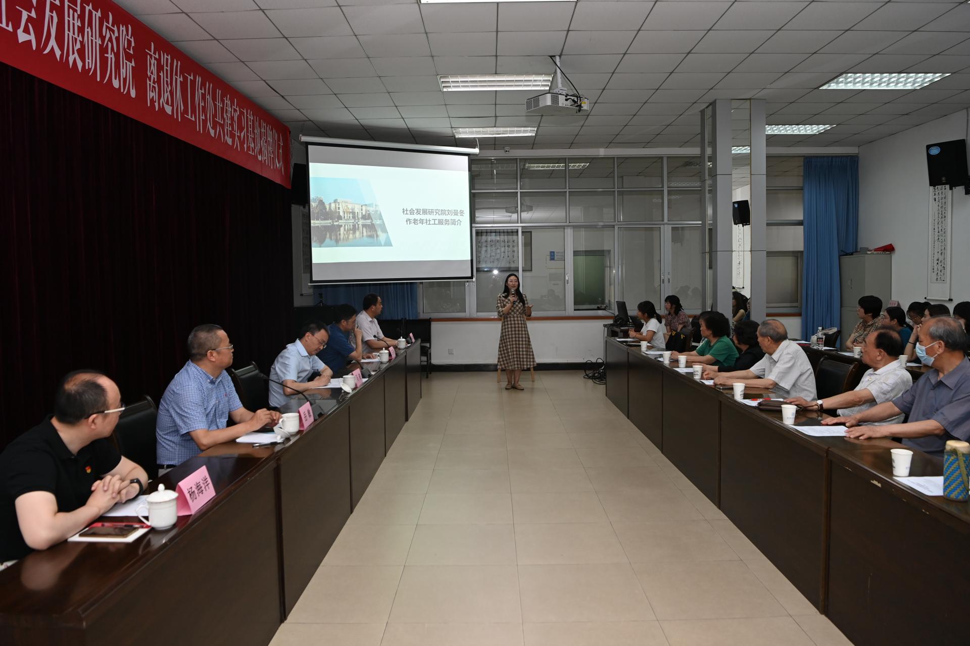 岳敏介绍了社会发展研究院的专业发展和师资队伍情况,张立斌介绍了学校离退休老同志的基本情况,双方表达了共建实习基地美好祝愿和合作信心。社会发展研究院教师刘曼冬和学生代表黄莉莉向大家介绍了老年社工服务的基本情况。