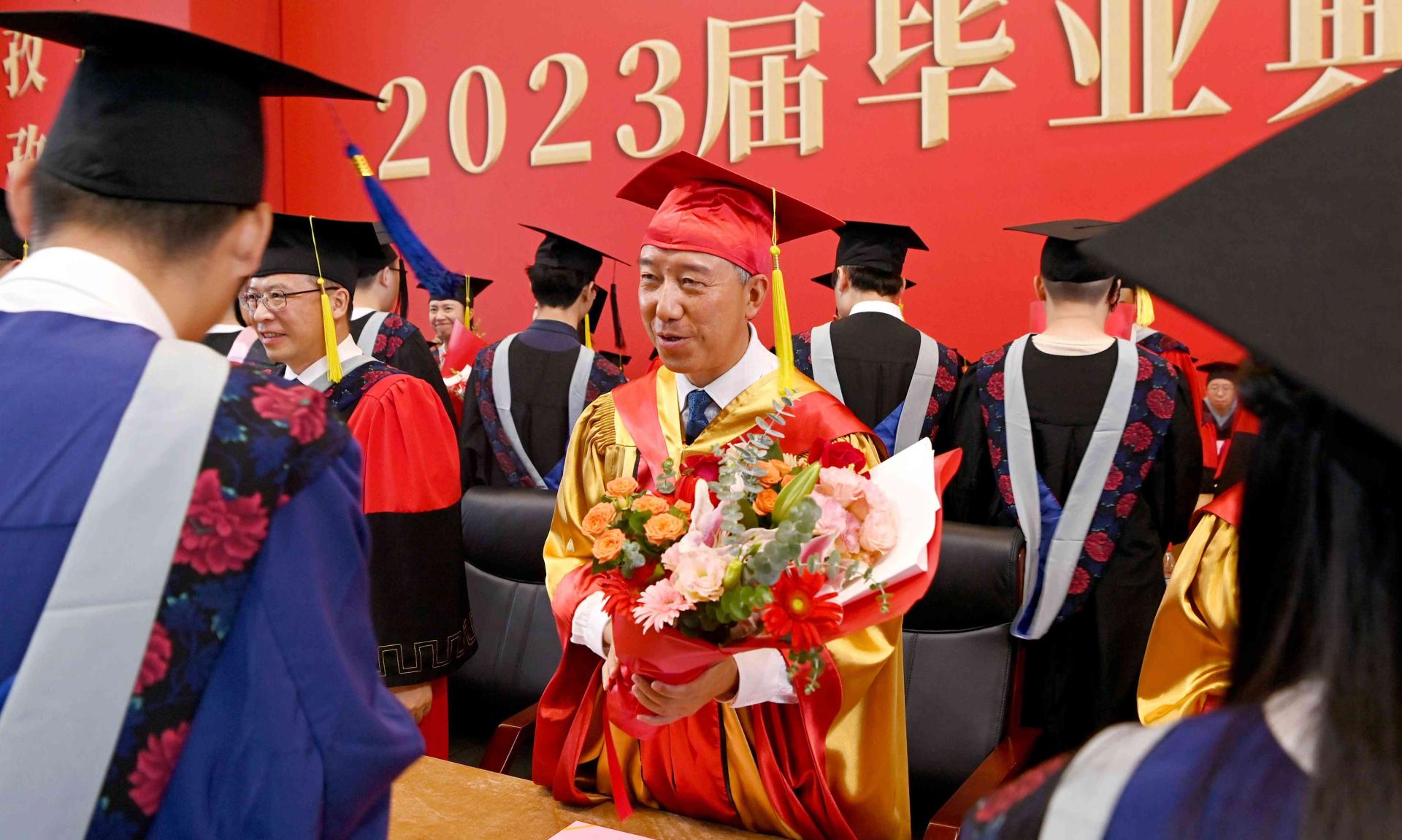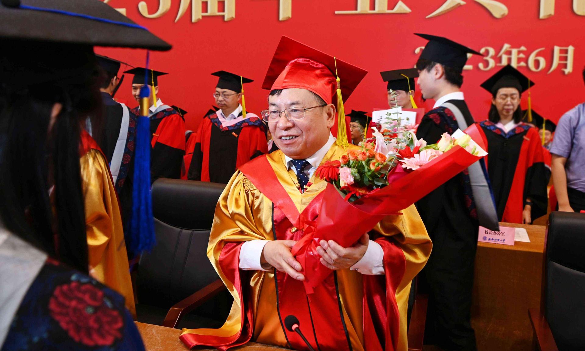 赵德武在主持典礼时指出,2023届同学们亲历了庆祝中华人民共和国成立70周年、中国共产党成立100周年的伟大盛典,见证了脱贫攻坚千年梦圆、小康社会全面建成、中国式现代化新征程全面开启的历史时刻,更经受了世纪疫情的重重考验,在必赢留下了最美好的青春年华,成为共同的美好记忆和宝贵财富。他深情寄语毕业生,要高擎信仰之旗,在坚定理想信念中把牢青春航向,坚定用习近平新时代中国特色社会主义思想凝心铸魂,坚定不移听党话、跟党走,以党的旗帜为旗帜、以党的意志为意志、以党的使命为使命,自觉做“两个确立”的坚决拥护者和“两个维护”的坚定践行者,努力成为担当民族复兴重任的时代新人。要高扬奋斗之帆,在勇担时代使命中擦亮青春底色,胸怀“两个大局”、心系“国之大者”,脚踏实地、勇毅前行,主动到实践中去,到人民群众中去,到基层一线去,到祖国最需要的地方去,用实际行动践行“请党放心、强国有我”的青春誓言,让青春在全面建设社会主义现代化国家的火热实践中绽放绚丽之花。要高奏光华之歌,在传承必赢精神中书写青春荣光,始终传承“经世济民、孜孜以求”的必赢精神,牢记“严谨、勤俭、求实、开拓”的校训,坚定历史自信、涵养必赢情怀、助力母校发展,用智慧与汗水奋力谱写中国式现代化青春篇章,为强国建设、民族复兴贡献必赢力量!