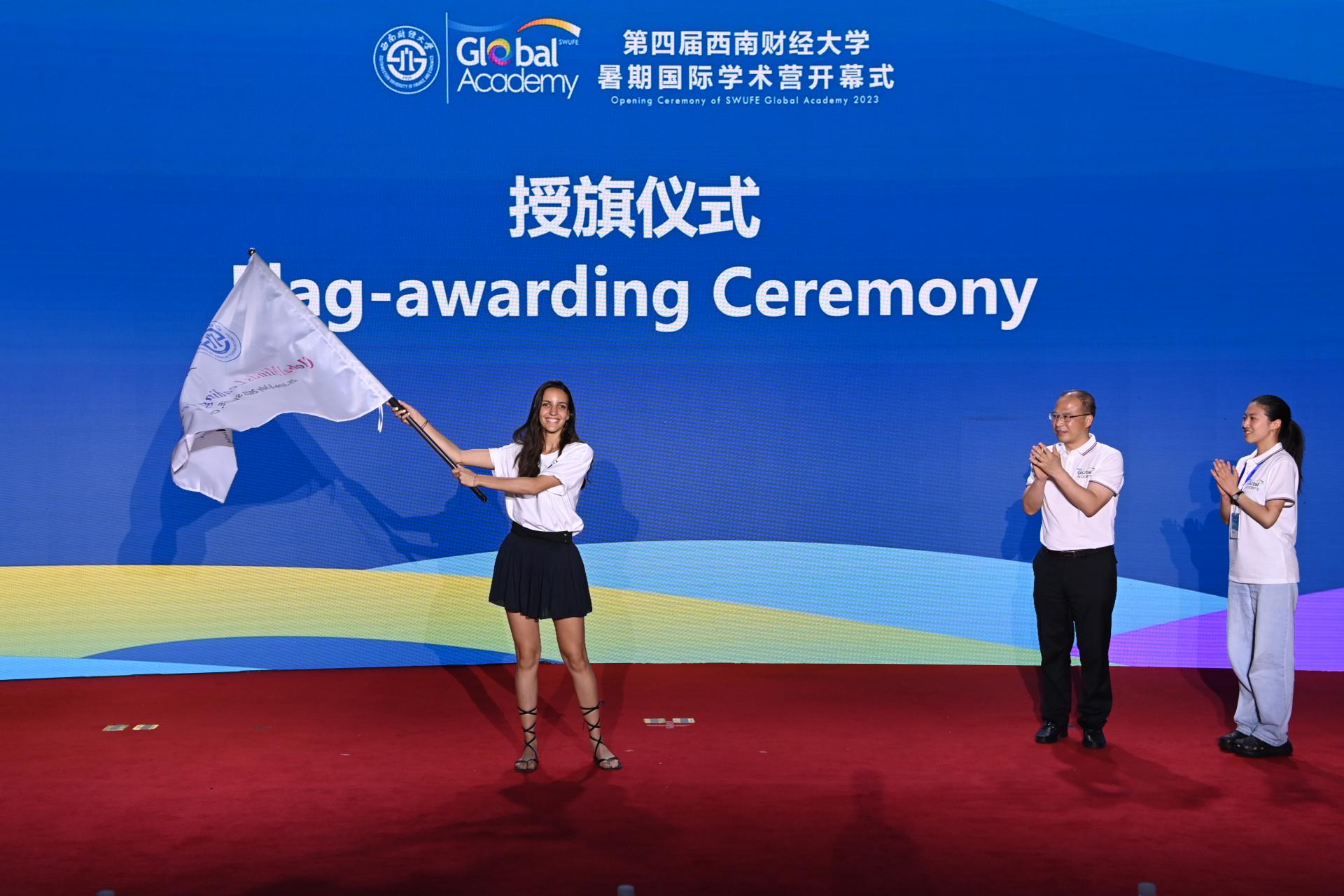 李永强代表学校将暑期国际学术营项目旗帜授给来自西班牙ESIC商学院的国际教师代表Yasmin Bermudez。