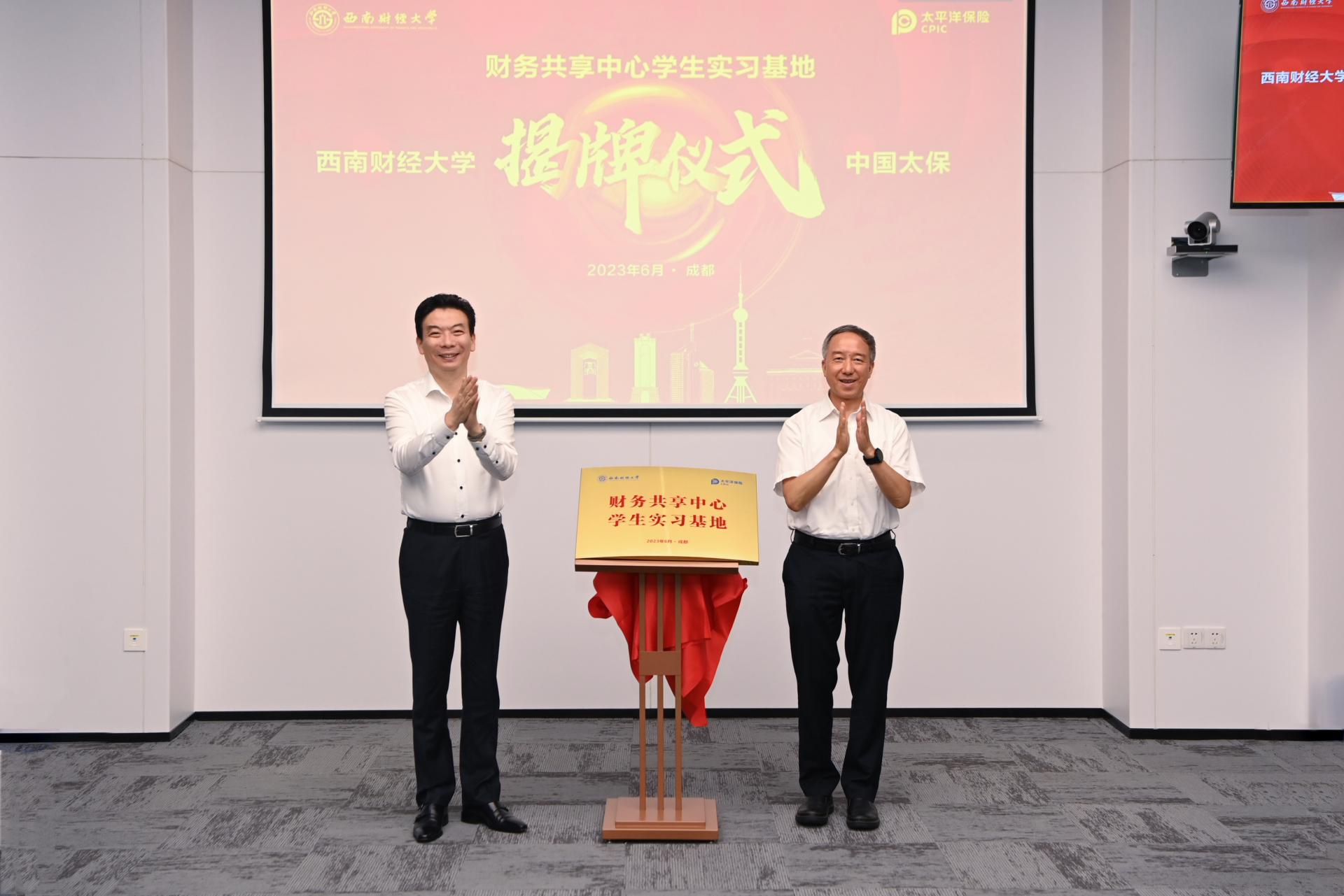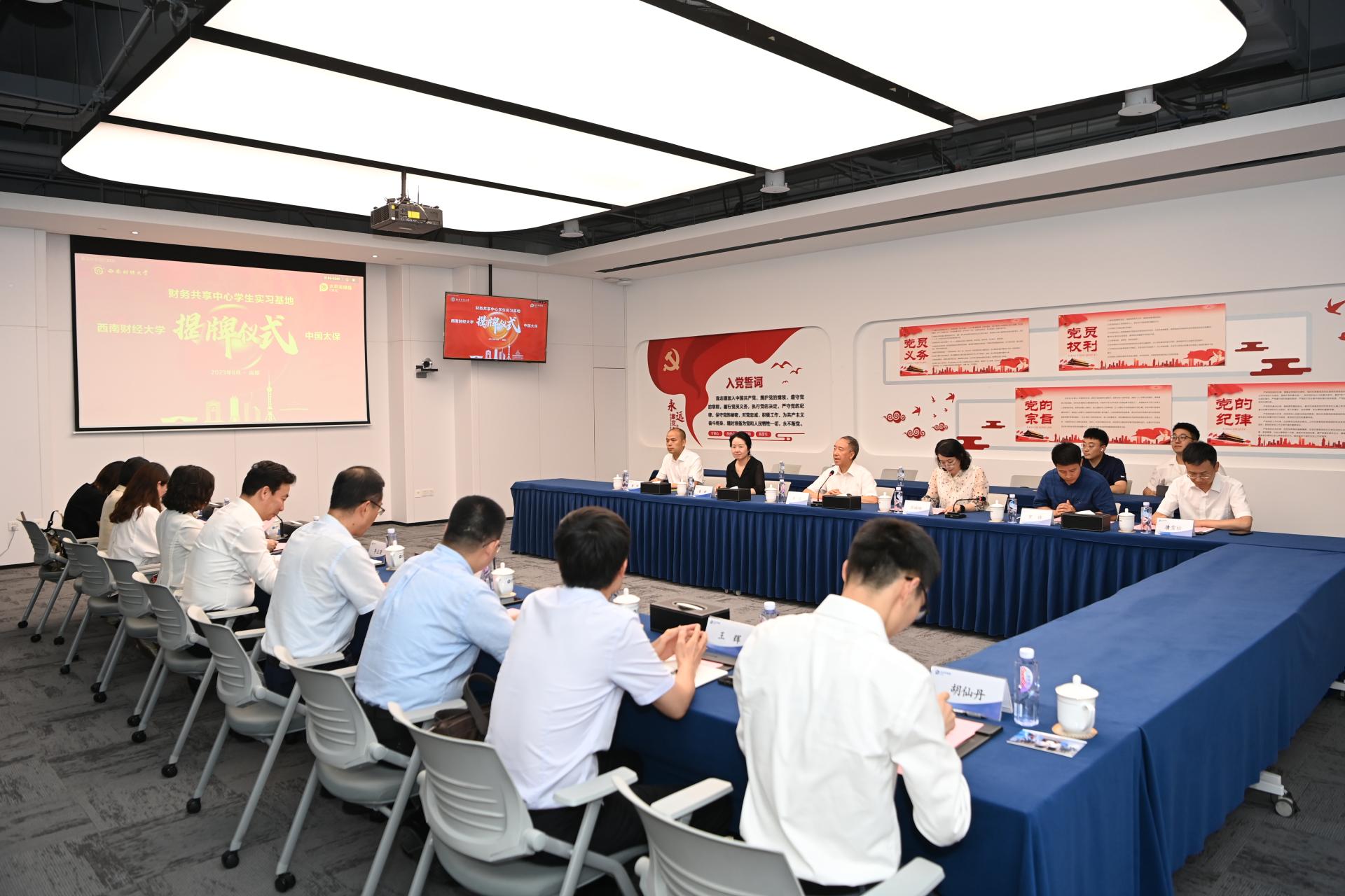 在学校深入开展学习贯彻习近平新时代中国特色社会主义思想主题教育之际,党委副书记、校长卓志率队访企拓岗座谈并与太平洋保险集团合作共建学生实习基地,这是学校继2018年与太平洋保险集团签署战略合作协议后,共同谱写产教融合人才培养新篇章的重要举措。6月28日,学生实习基地揭牌仪式在成都太平洋保险大厦举行,太平洋保险(集团)党委副书记、组织部部长季正荣,副总会计师徐蓁,工会主席、直属党委副书记李政以及集团相关部门,太平洋财险、寿险,四川省分公司,财务数据共享中心等部门负责人;学校校长办公室、学生工作部、学生职业规划与就业指导中心、金融学院、会计学院等负责人参加揭牌仪式。