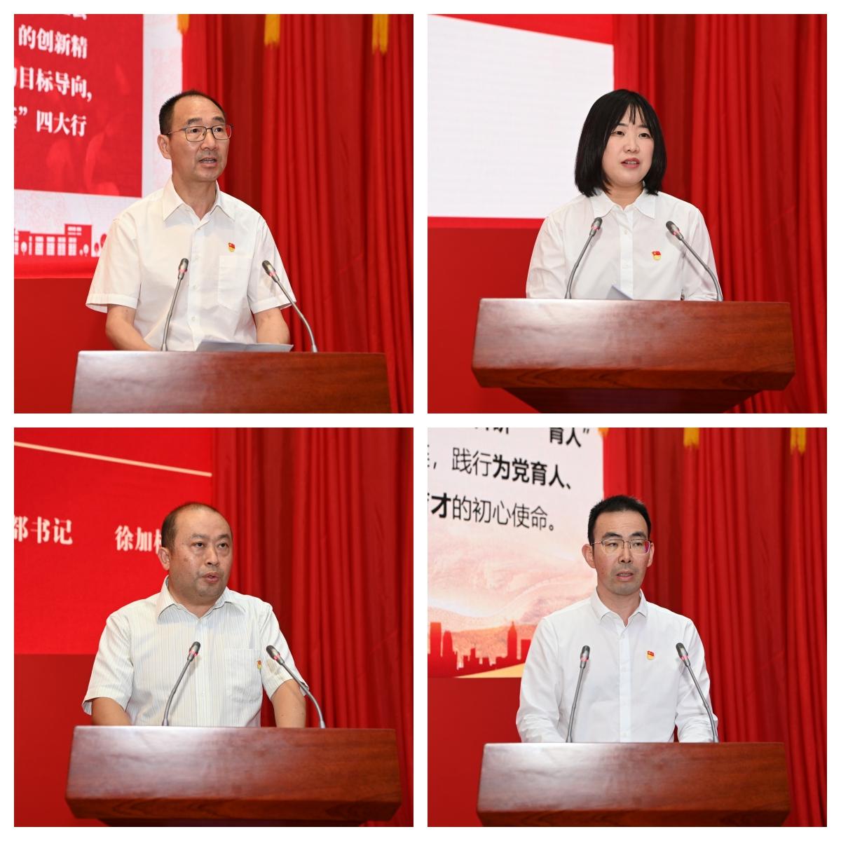 获奖创建单位代表上台交流发言。会计学院党委书记刘晓彬同志介绍了以“创新先锋”党建工作品牌推进学院党建和事业发展“一融双高”的生动实践。后勤服务总公司党委书记张谛同志介绍了以“精细化、精准化、精益化”目标为内核的“‘三精’育人”党建工作品牌。金融学院与中国金融研究院教师党支部书记徐加根同志围绕“课程育人、科研育人、服务育人”介绍了“三聚三强”支部工作法。经济学院教师第一党支部书记韩文龙同志介绍了“铸魂强链”工作法的特色做法和突出成效。