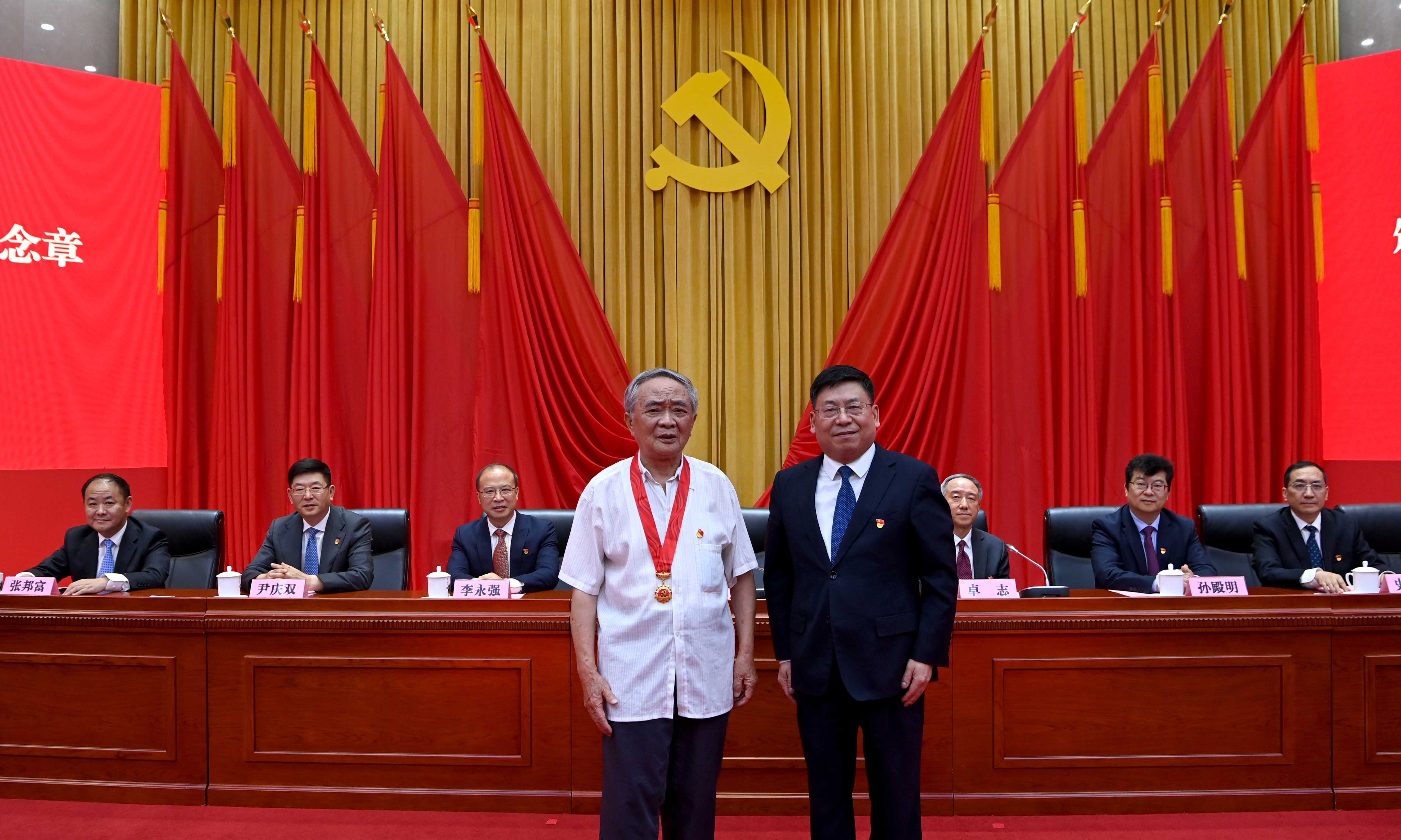 赵德武为周仁贵、陈远富两名老党员颁发“光荣在党50年”纪念章。