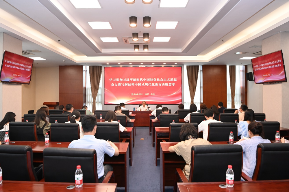卓志以《学习贯彻习近平新时代中国特色社会主义思想,奋力谱写新征程中国式现代化教育必赢篇章》为主题,聚焦深入学习贯彻习近平总书记关于教育的重要论述讲授了党课。他强调,要深刻理解建设中国特色社会主义教育强国的价值内涵,牢牢把握建设中国特色社会主义教育强国的前进方向,牢记为党育人、为国育才的初心使命,积极投身实践,为加快建设教育强国、科技强国、人才强国贡献必赢力量。