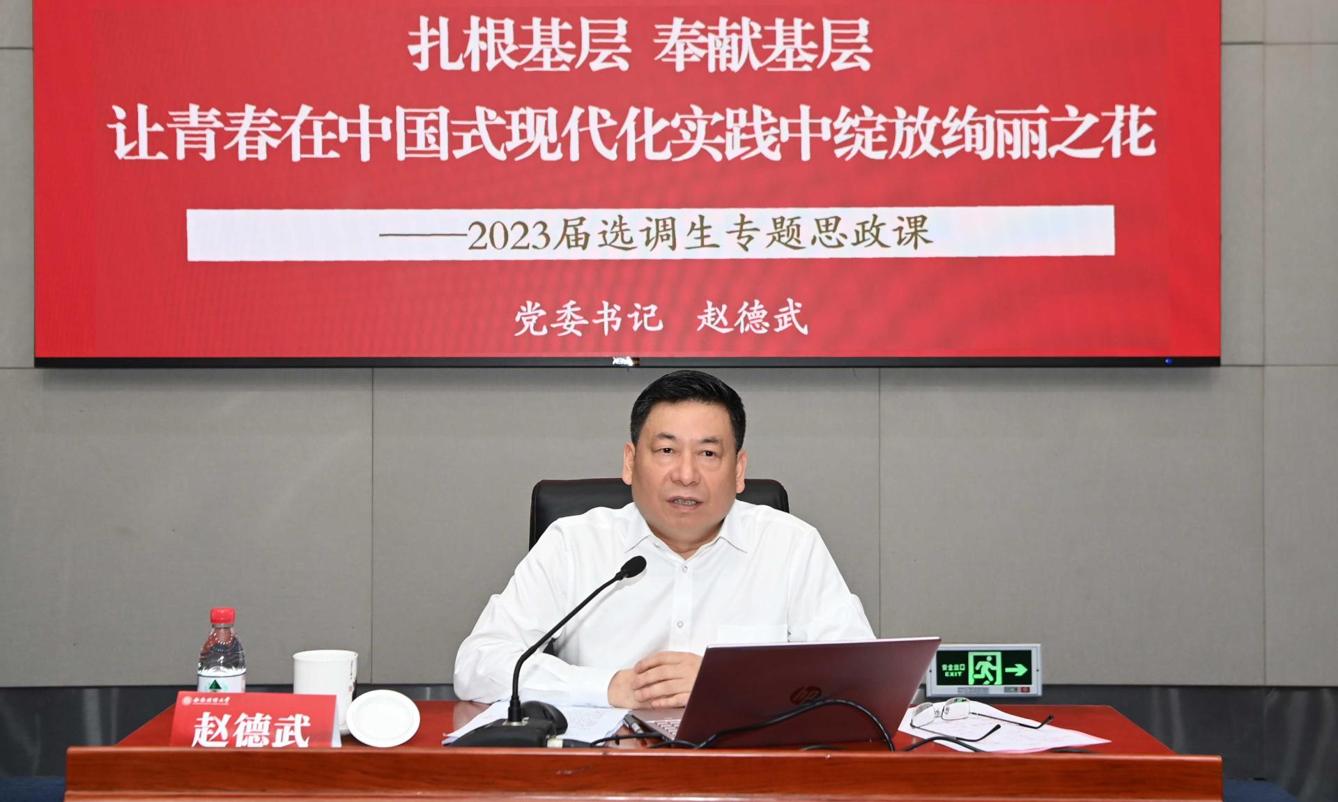 赵德武以《扎根基层、奉献基层,让青春绽放绚丽之花》为题为全体选调生讲专题思政课。围绕基层历练为什么重要、新时代需要什么样的年轻干部、怎样在实践中历练成长三个方面,赵德武深入阐述了选调生制度的发展历程、基层历练的重要意义以及“新时代好干部标准”、对年轻干部的“七种能力”重要要求,饱含深情地向即将踏上工作岗位的选调生寄予了殷切期望,希望大家坚持以习近平新时代中国特色社会主义思想为指引,牢记总书记对青年干部的殷切嘱托,坚持信念上永不动摇、精神上永不懈怠、心态上永不急躁、工作上永不满足、学习上永不松劲、处事上永不自负、廉洁上永不越线,让青春在全面建设社会主义现代化国家的火热实践中绽放绚丽之花、贡献必赢力量!