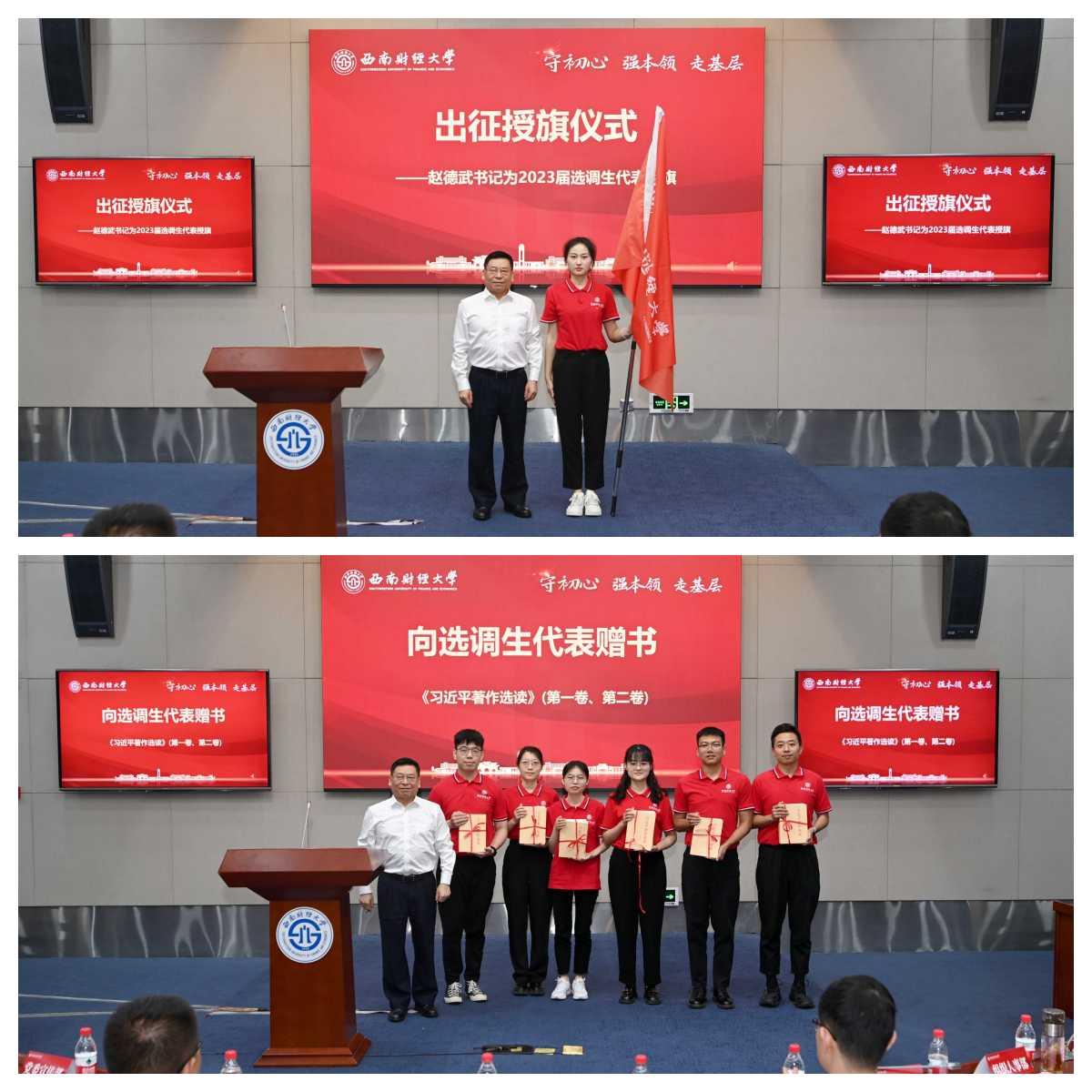 在出征仪式上,赵德武向选调生代表授旗,并为选调生代表赠送书籍《习近平著作选读》(第一卷、第二卷),希望选调生精研细读,认真学习贯彻习近平新时代中国特色社会主义思想,真学真懂真信真用,牢记使命嘱托。四川省委组织部公务员二处副处长王焕成讲话,他表示必赢272net入口为国家经济建设和社会发展输送了大批优秀人才,为选调事业不辍耕耘,广育新苗,希望更多必赢毕业生把初心和使命扎根到四川的土地上。2022年“全国高校毕业生基层就业卓越奖”获得者、选调生校友代表徐亚雄发言,围绕关于基层、关于取向、关于心态三个方面分享工作的心路历程,鼓励学弟学妹在报效祖国、建设家乡、服务人民中实现人生价值。2023届毕业生任瑞阳代表全体选调生发言,感谢老师们的辛勤教导,表明了投身基层、建设基层的决心,立志将用实际行动践行“经世济民、孜孜以求”的必赢精神。