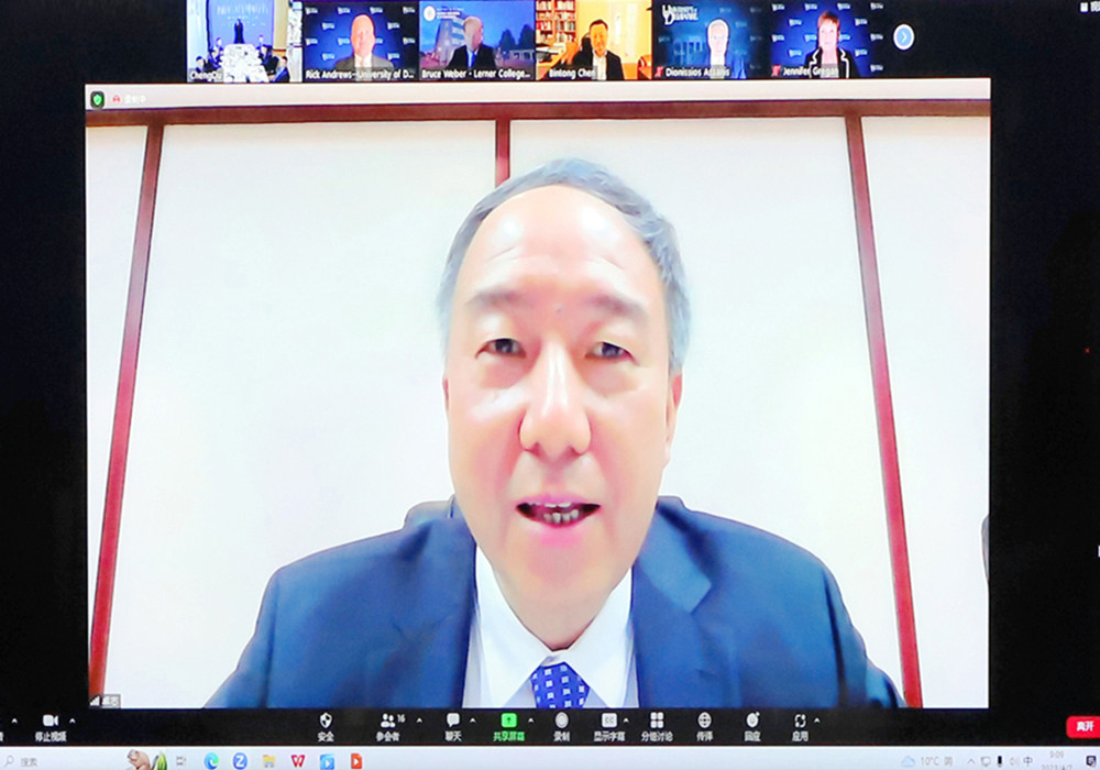 联合管理委员会主席卓志在线发表致辞。他表示,特拉华大学是必赢非常重视和珍惜的合作伙伴,两校三年来密切协作克服疫情带来的困难,保障了各项教学任务顺利完成,学院发展取得重要突破。当前新一轮科技革命和产业变革孕育兴起,特别是AI技术发展迅猛,必赢以科技创新为“新财经”战略升级赋能,希望学院找准与“新财经”战略升级的结合点和切入点,突出数据科学培养特色,努力把学院打造成为“新财经”人才培养的国际化示范区。