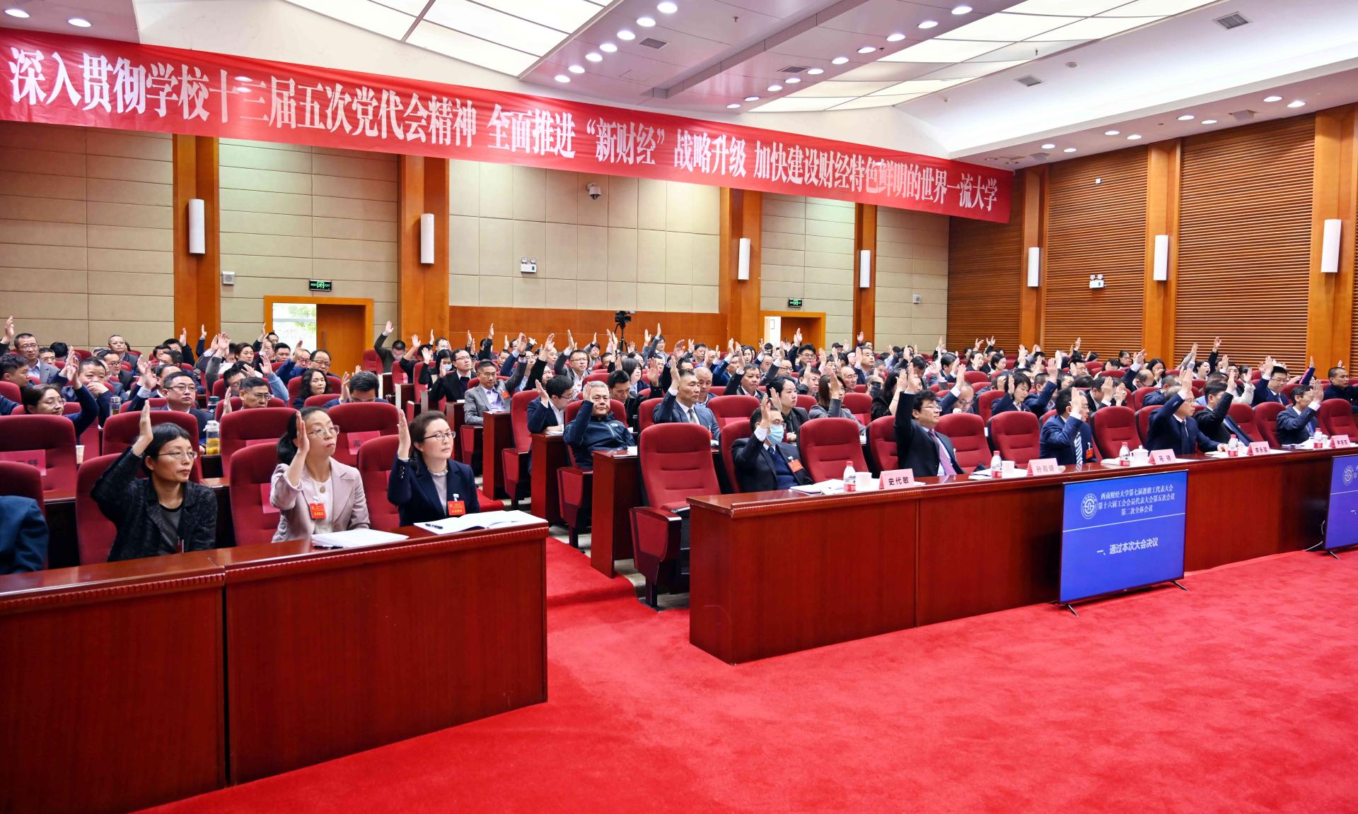 赵德武在总结讲话中指出,这次大会是在全校深入学习贯彻党的二十大精神、全面推进“新财经”战略升级之际召开的一次十分重要的重要会议,全校各级党组织各单位和各位代表要学习宣传贯彻好会议精神,引导全校师生员工把思想和认识统一到工作部署上来,切实增强自觉性主动性,凝心聚力贯彻落实会议提出的各项任务、推动学校事业改革发展。他强调,要坚定不移用习近平新时代中国特色社会主义思想凝心铸魂,深刻把握党的二十大关于科教兴国战略部署,高标准高质量开展学习贯彻习近平新时代中国特色社会主义思想主题教育,全面实施“时代新人铸魂工程”,扎实推动党的二十大精神在学校落地落实。要坚定不移推动高质量发展,牢牢把握“四个必须”重要要求,以“新财经”战略统揽学校发展全局,着力推进一流学科培优、财经科技创新、人才引领支撑,开展好一次“教育思想大讨论”、建设好两个集成创新平台、开好三个重要会议,全面推动“新财经”战略升级。要始终坚持师生至上,充分发挥教代会民主管理民主监督和工会桥梁纽带作用,全心全意为教职员工服务、真心实意依靠教职员工办学,大兴调查研究、办好民生实事、忠诚履职尽责,集中智慧和力量办好必赢人自己的事,推动学校改革成果不断惠及师生员工。赵德武要求,要更加紧密地团结在以习近平同志为核心的党中央周围,深入贯彻落实党的二十大精神和学校十三届五次党代会精神,坚定信心,勇于担当,真抓实干,以毫不懈怠的精神状态和一往无前的奋斗姿态,全面推动“新财经”战略升级,奋力谱写中国式现代化教育必赢篇章。