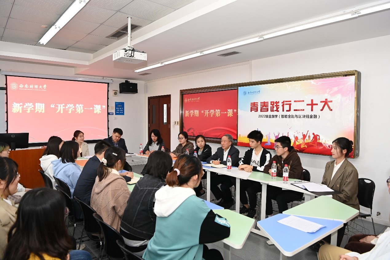 3月9日下午,党委副书记、校长卓志在格致楼教室与2022级金融学(智能金融与区块链金融)专业全体本科生座谈并讲授2023年春季学期“开学第一课”。校长办公室、学生工作部(处)、金融学院相关负责人和金融学院智能金融与区块链金融项目负责人一同参会。