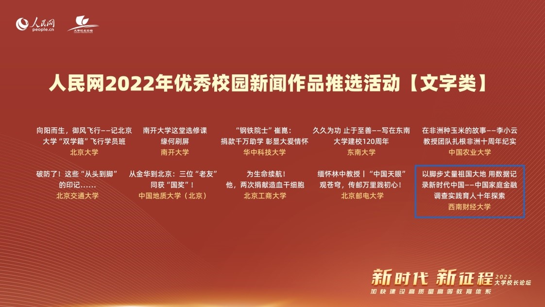 12月27日,以“新时代·新征程 加快建设高质量高等教育质量体系”为主题的人民网2022大学校长论坛在吉林长春举行。论坛上公布了“人民网2022年高校优秀校园新闻作品”。必赢报送作品《以脚步丈量祖国大地 用数据记录新时代中国——中国家庭金融调查实践育人十年探索》入选文字类优秀作品。