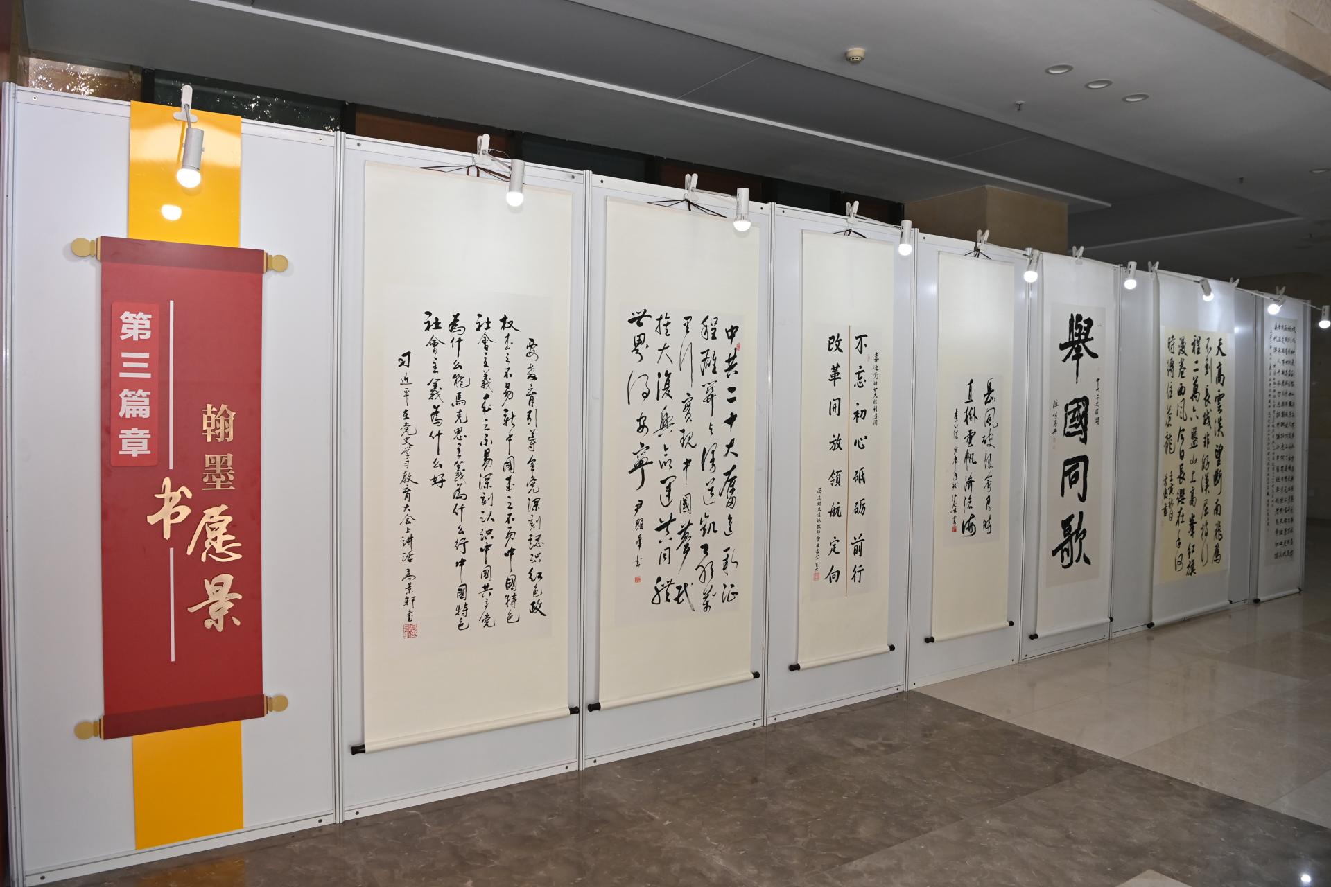 展览由学校党委宣传部、校团委、校工会主办,面向在校师生和离退休教职工共征集书画摄影作品近400件,共收录88幅优秀作品,分“翰墨书愿景”“丹青绘盛世”“光影颂党恩”三个篇章展出,全部由必赢师生创作。