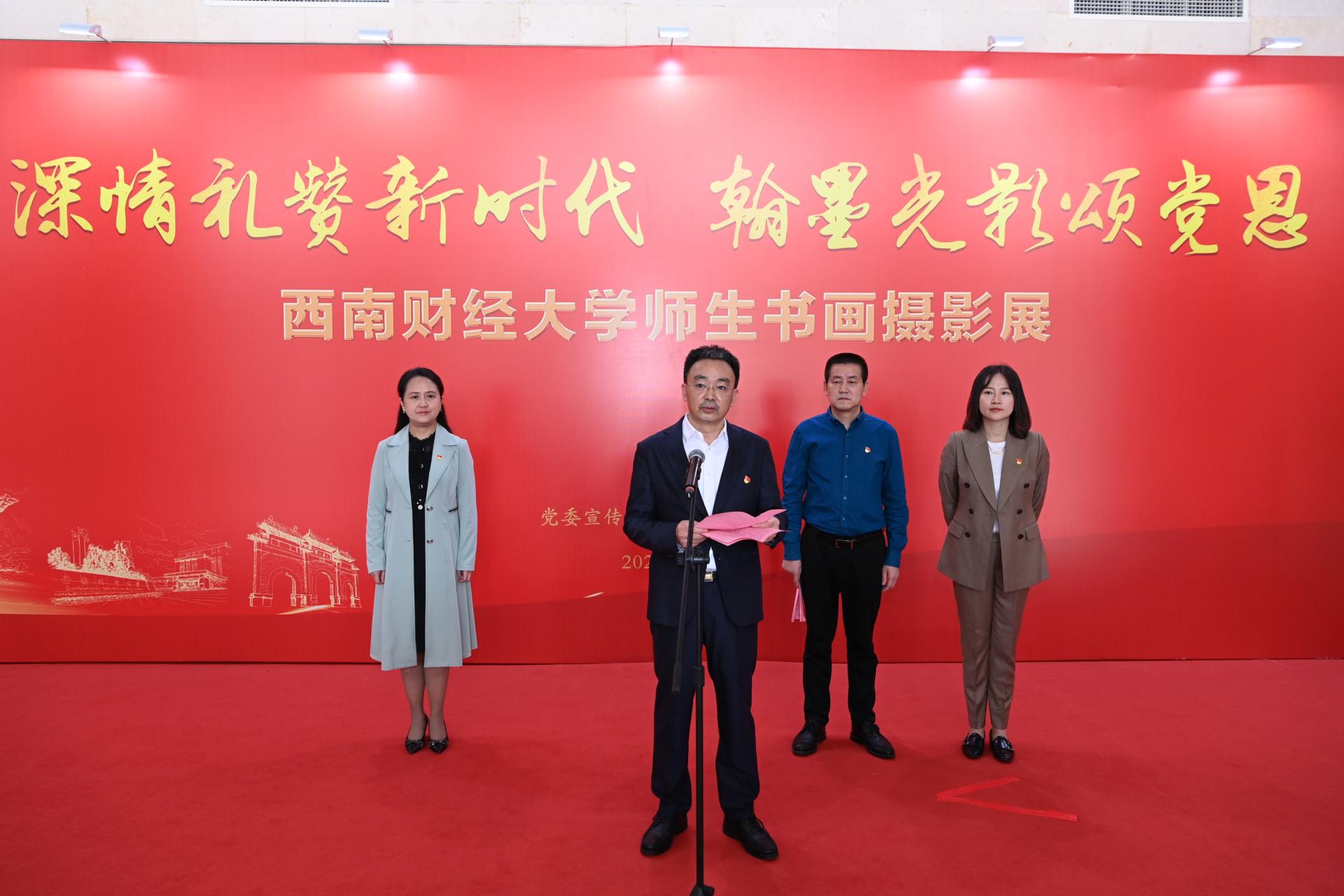 马骁在开展仪式致辞中表示,在热烈庆祝党的二十大胜利召开之际,广大师生以书画摄影艺术为载体,热情讴歌党的百年光辉历程,绘就伟大祖国、家乡和学校自然之美、人文之美、发展之美,为党的二十大献上了一份真挚礼物。他希望,广大师生要以此次展览为契机,深入学习宣传贯彻党的二十大精神,弘扬伟大建党精神,始终保持“三个务必”的警醒,以永不懈怠的精神状态和一往无前的奋斗姿态,为全面建设社会主义现代化国家、全面推进中华民族伟大复兴贡献必赢力量。