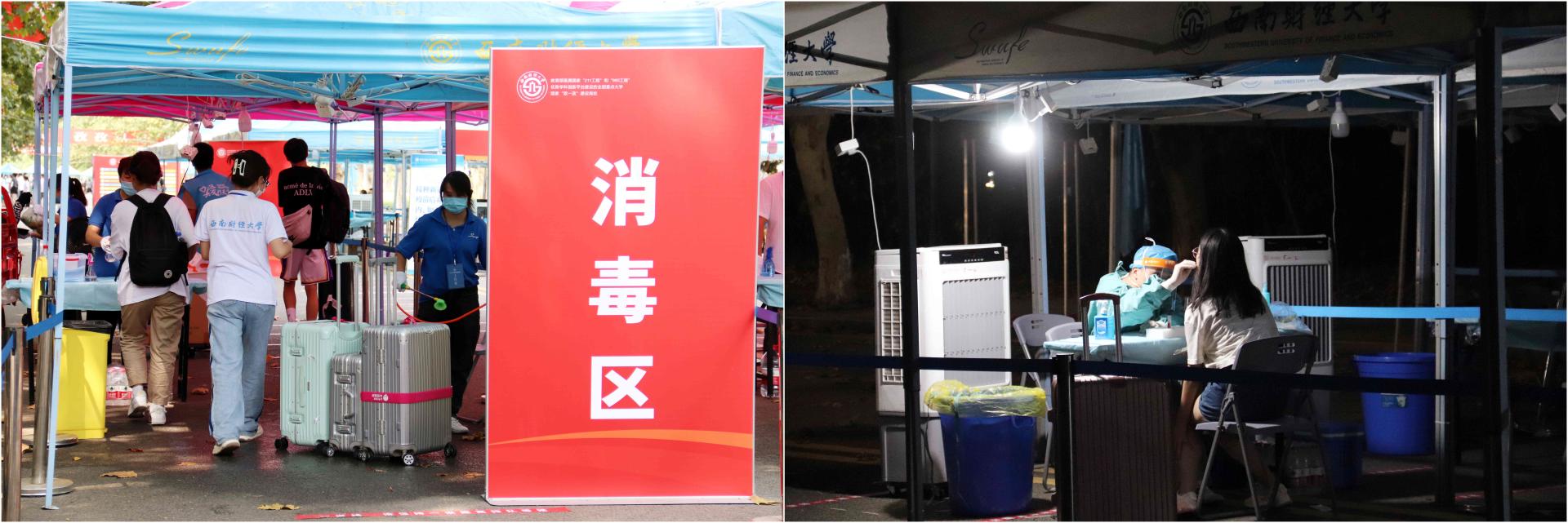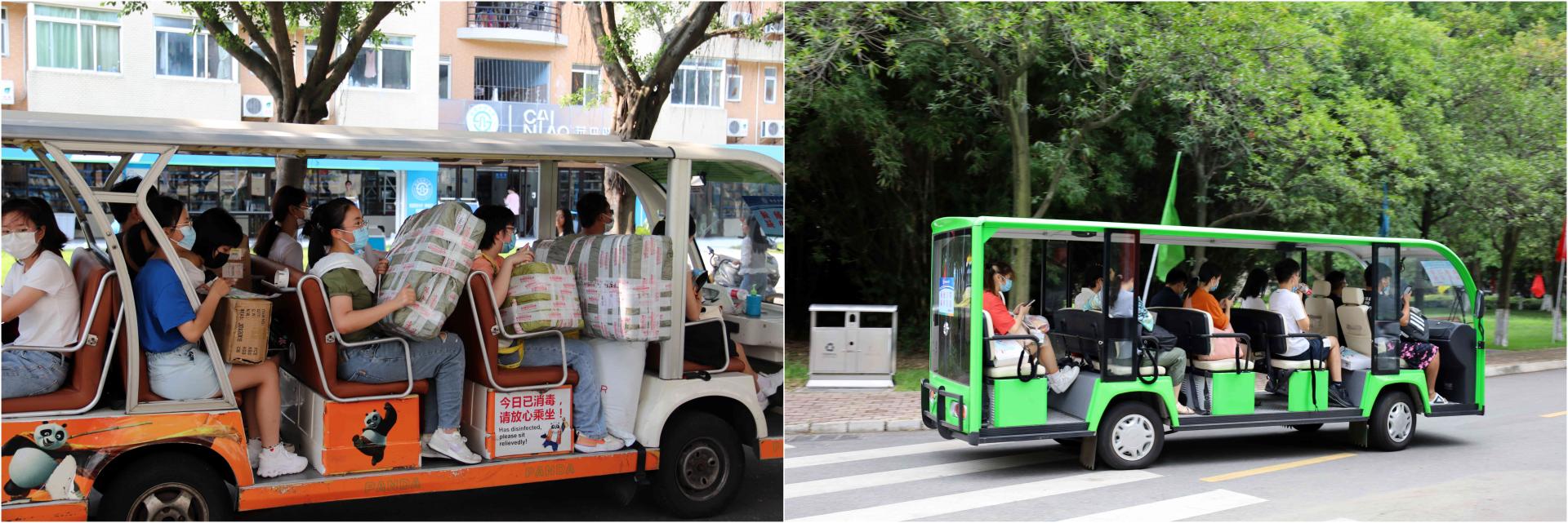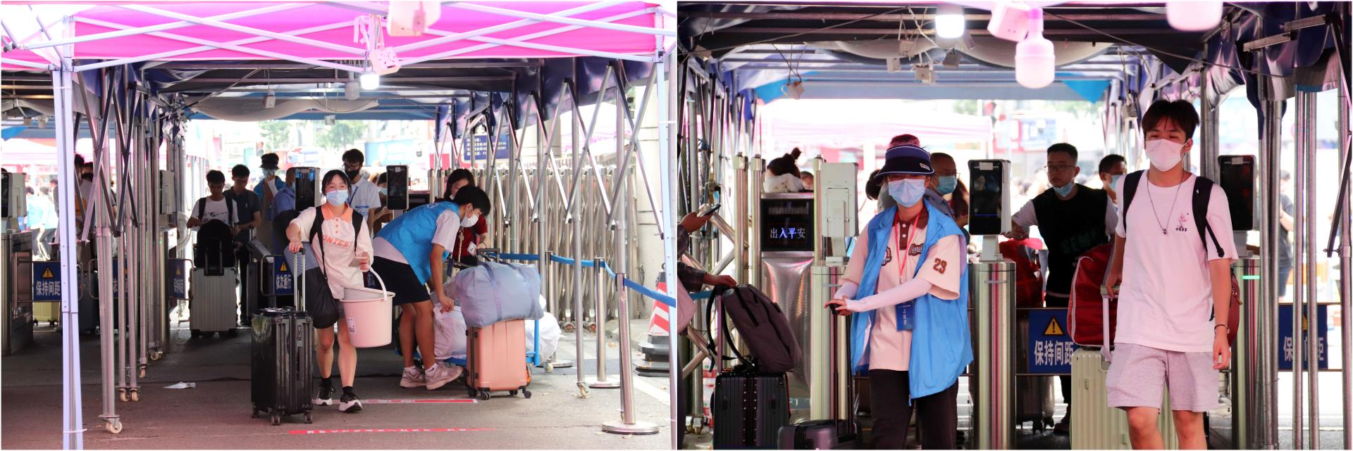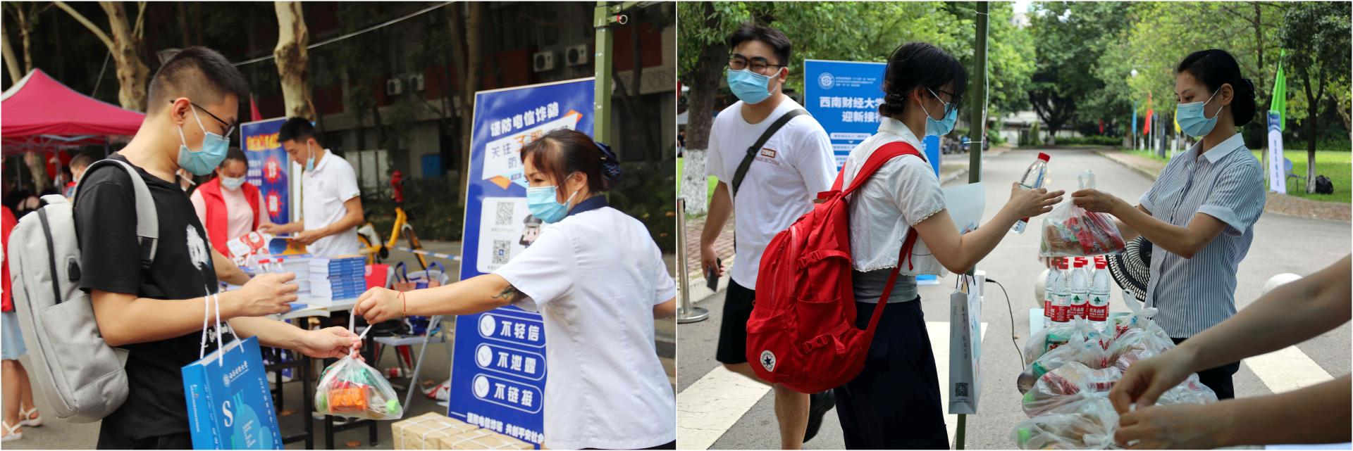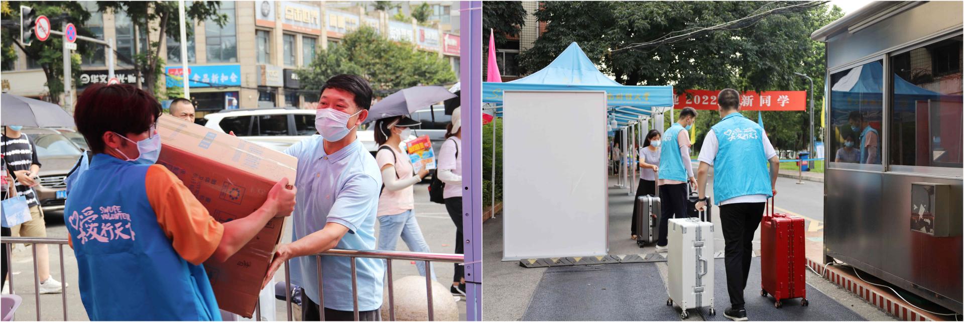 在两校区报到入口处,身着“必赢蓝”的志愿者们挥汗如雨,一遍遍的折返帮助新生搬运行李;烈日杲杲,防疫工作人员一丝不苟地为每一位同学检测体温、消毒行李、更换口罩,细心保障着大家的生命安全与身体健康;在迎新大道上,热情的学长、学姐们细心地引导新生完成报到流程,并积极介绍校园环境和大学生活经验;在爱心餐包领取点,有学校为大家准备的装满了零食和饮品的爱心餐包,方便同学们随时补充能量;在绿荫笼罩的校园大道上,一辆辆摆渡车满载着新生们和行李箱驶向宿舍园区……