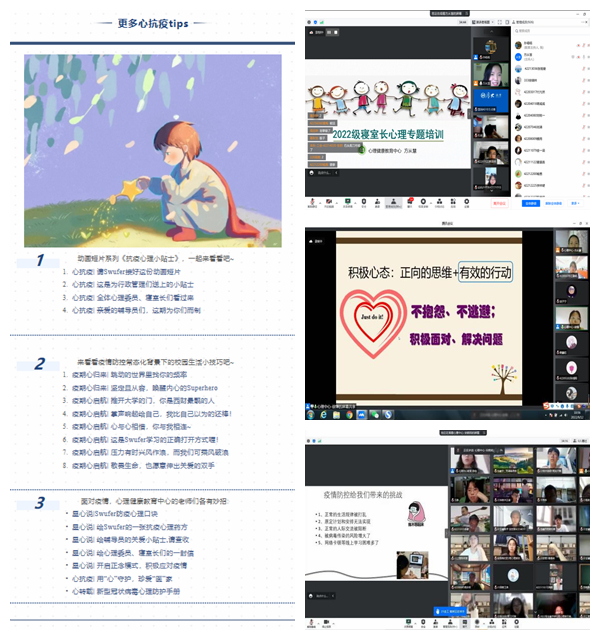 多措并举,全力做好保障服务,不断完善疫情防控背景下的心理危机干预预防体系。协同教师工作部,做好心理健康应急组专项工作预案,尽最大努力防止疫情应急期间师生次生危害发生;组织开展新生心理委员、寝室长心理骨干疫情下心理危机识别与管理、心理骨干职责等专题培训,覆盖相关学生干部1400人次,提高朋辈心理危机识别和干预能力;联系学院(研究院)开展心理危机摸排,对疫情防控期间情况特殊学生及时给予针对性指导,加强学生关心关爱与心理疏导。