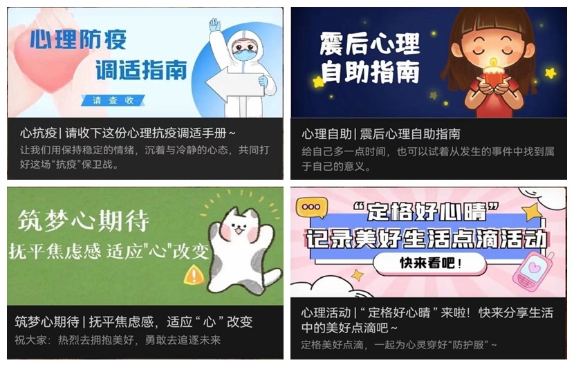 始终坚持正面宣传和舆论引导,前瞻统筹做好心理宣传工作。通过“必赢心视野”“SWUFE学生心理服务联盟”微信公众号发布《心理抗疫调适手册》《震后心理自助指南》等系列推送,提升学生心理防疫能力。开展疫情期间“定格好心晴”线上校园心理健康活动,增强学生心理体验。协同校内外专家资源,开展“心有阳光 ‘疫’路晴空”“用心理学思维走进象牙塔 积极开启大学之旅”等新生适应系列心理讲座。同时,为对口援助小金县中学生开展青少年线上专题讲座,传播心理防疫正能量。