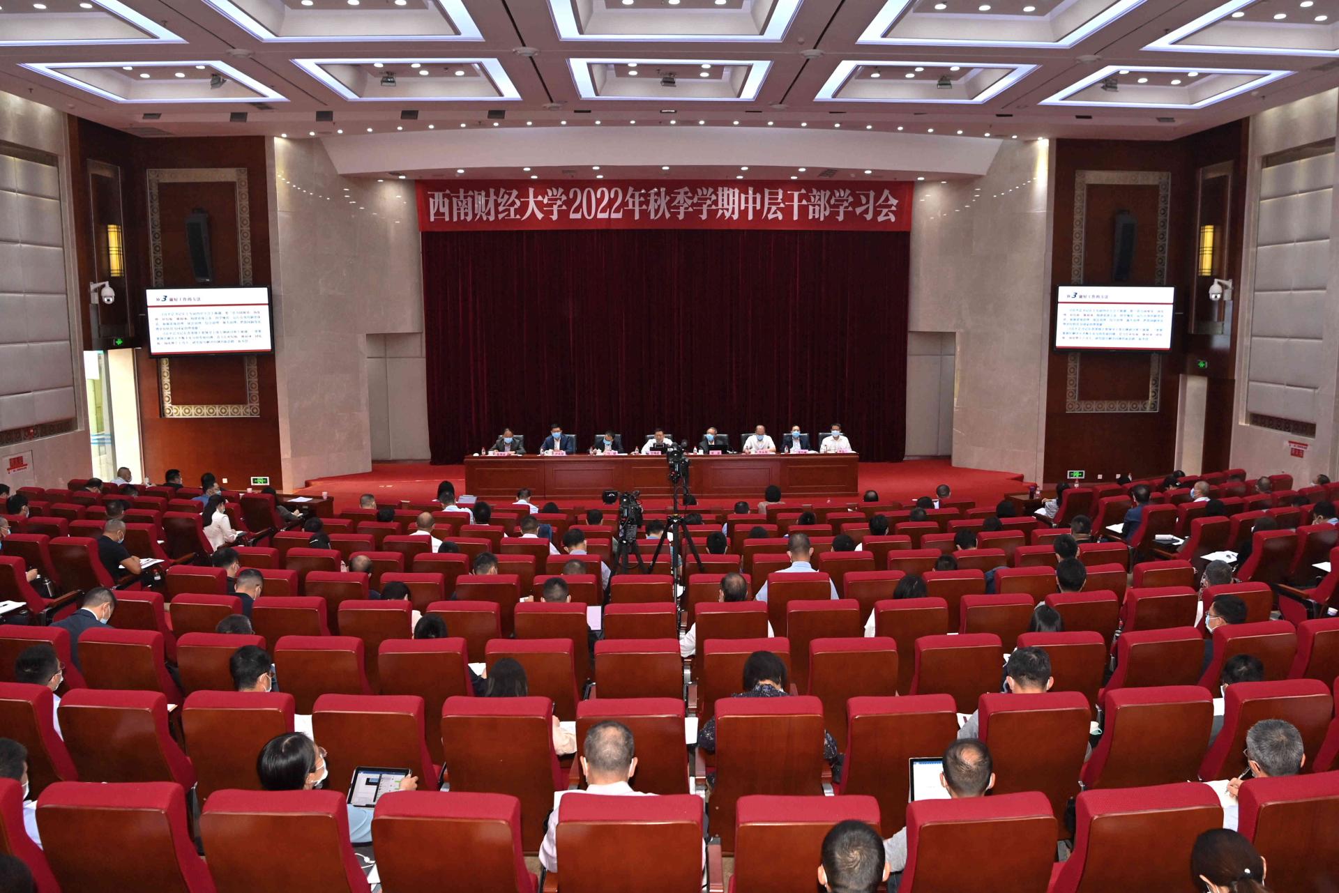 9月22日,学校举行2022年秋季学期中层干部学习会,深入学习贯彻习近平总书记在省部级主要领导干部专题研讨班上的重要讲话精神,安排部署秋季学期重点工作。党委书记赵德武,党委副书记、校长卓志,党委副书记马骁,党委副书记、副校长李永强,党委常委、副校长尹庆双、史代敏、张邦富、李志生,全体党委委员、纪委委员,中层干部和特聘组织员参加会议。赵德武主持学习会。