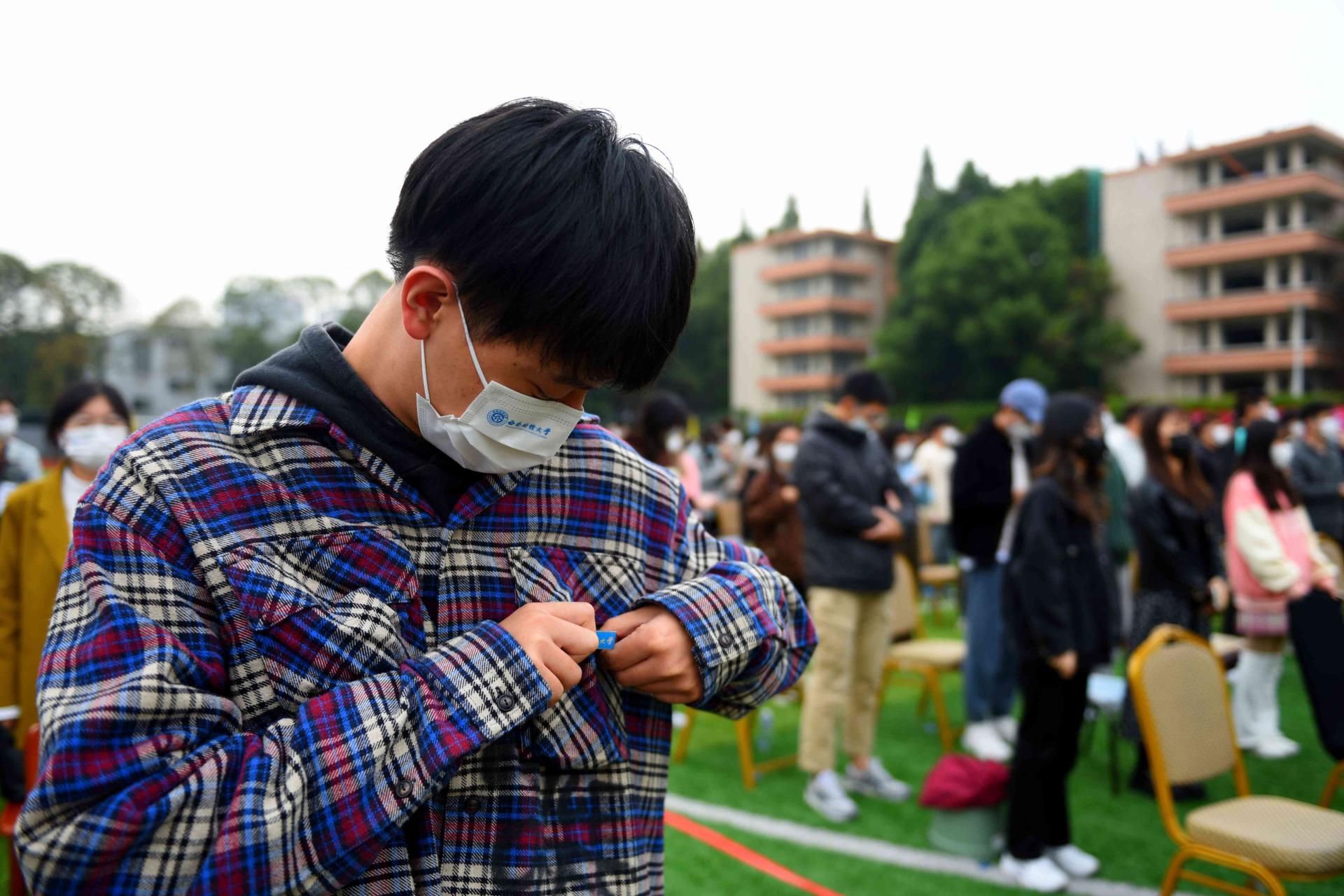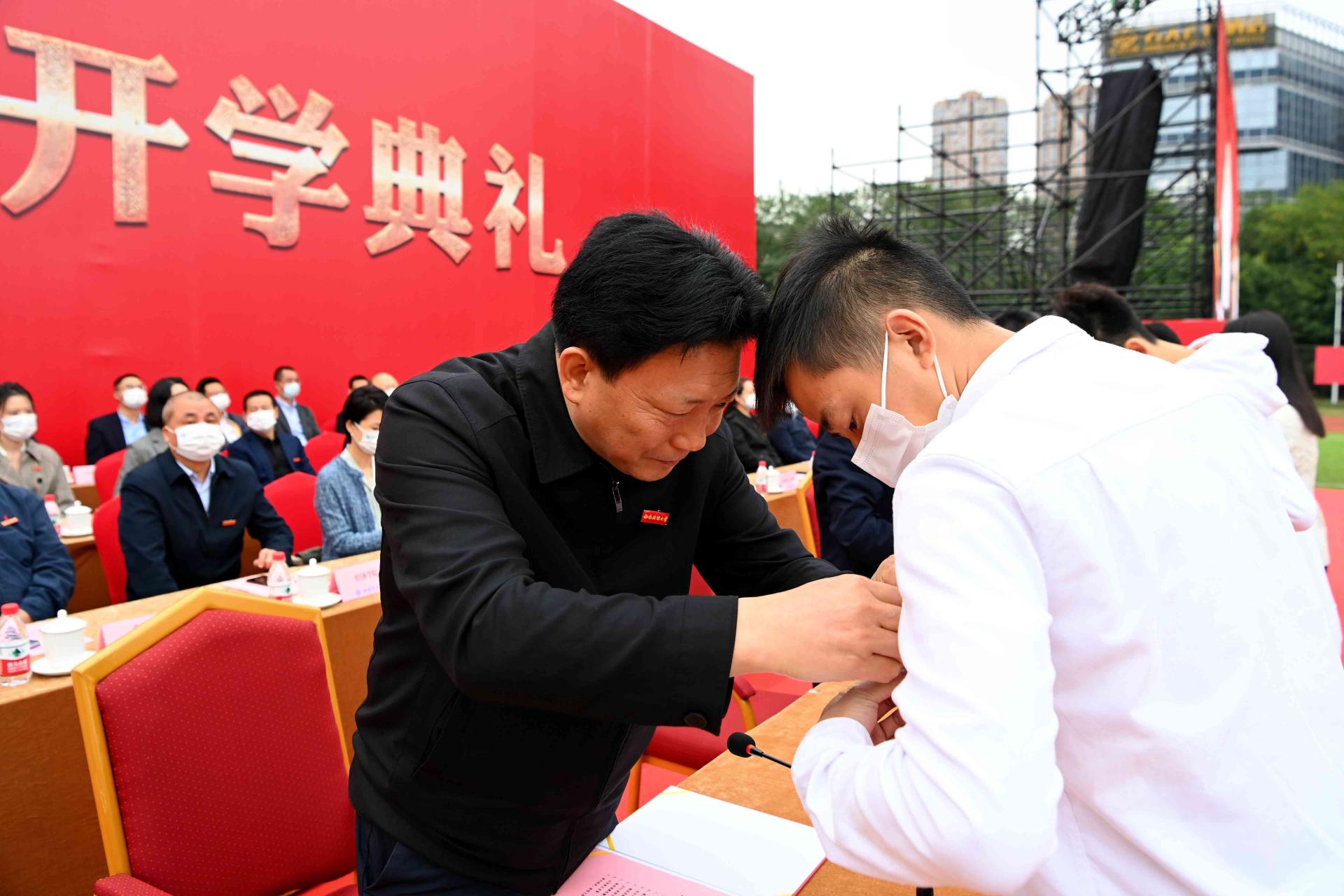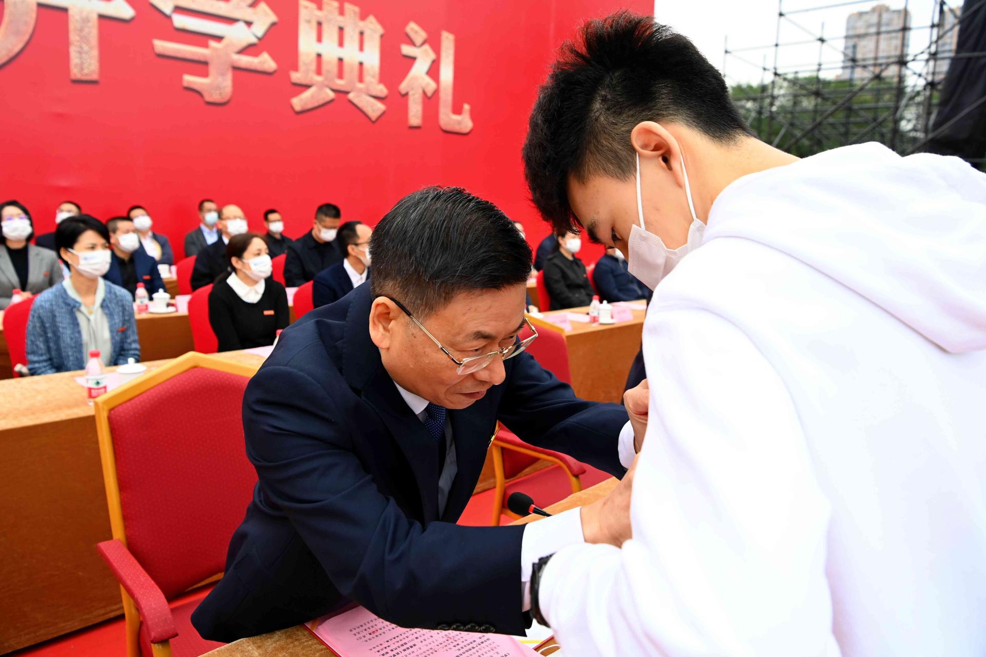 典礼仪式上,刘立云和学校领导为新同学代表佩戴校徽,全体新同学现场集体佩戴校徽并庄严宣誓。