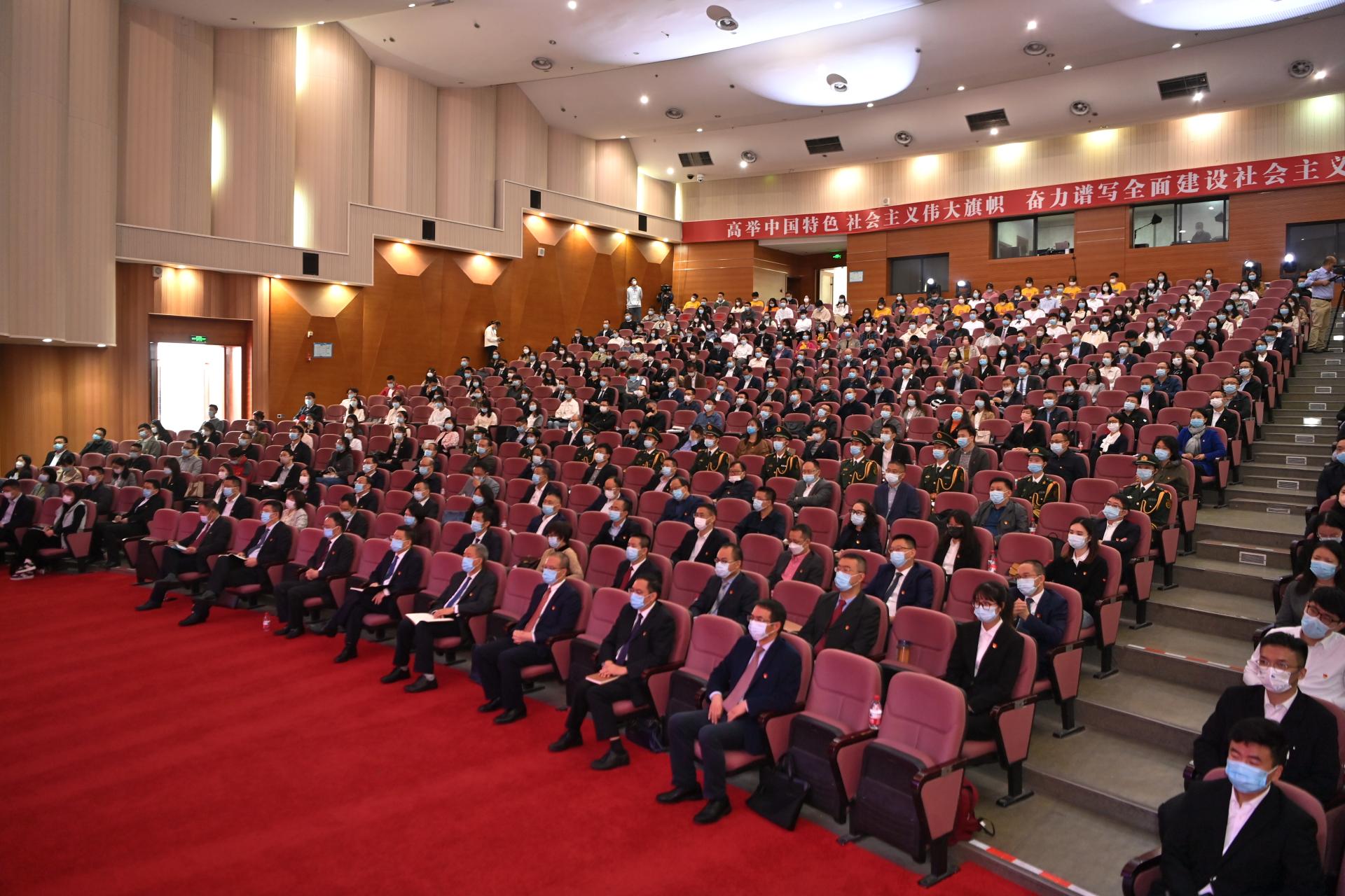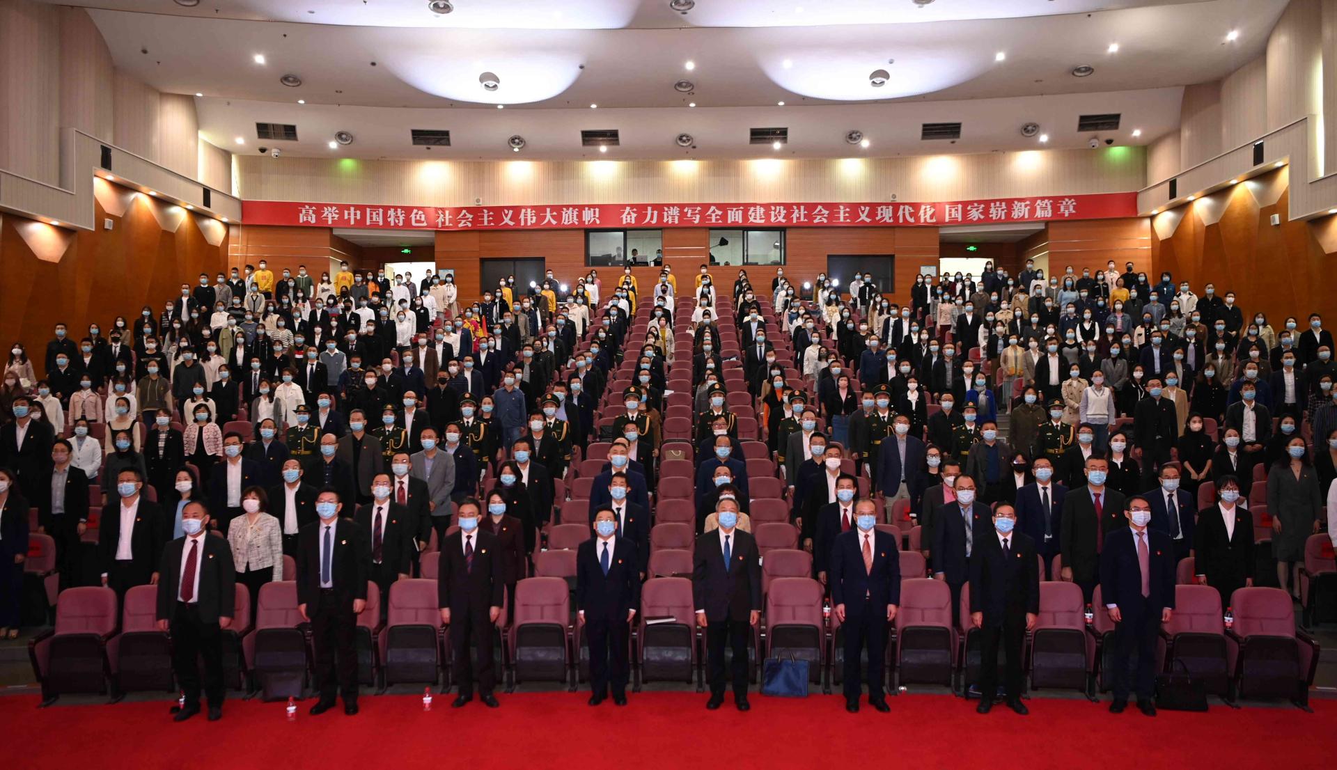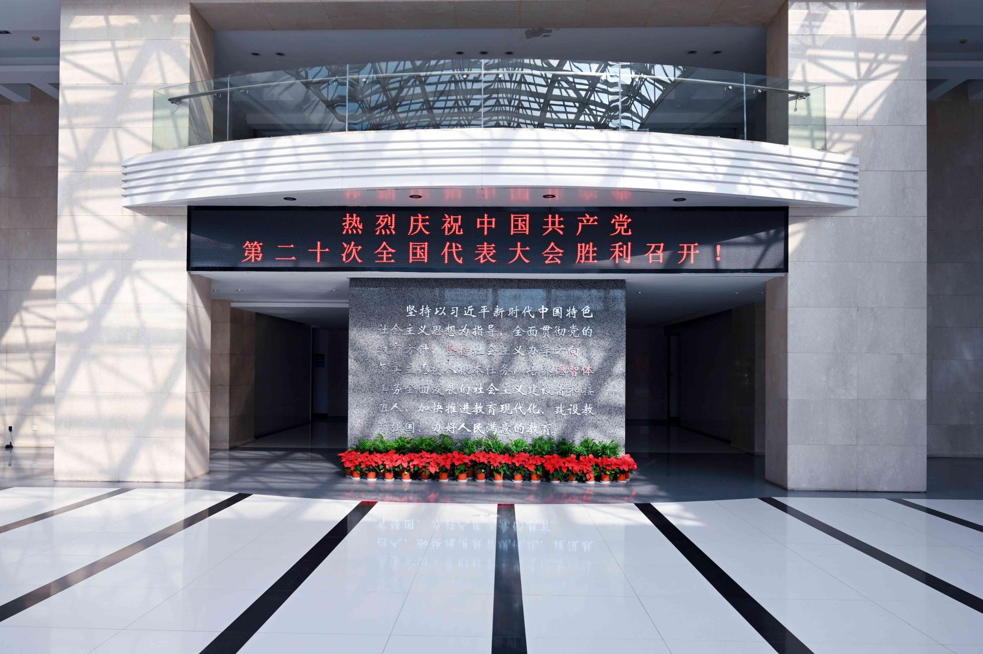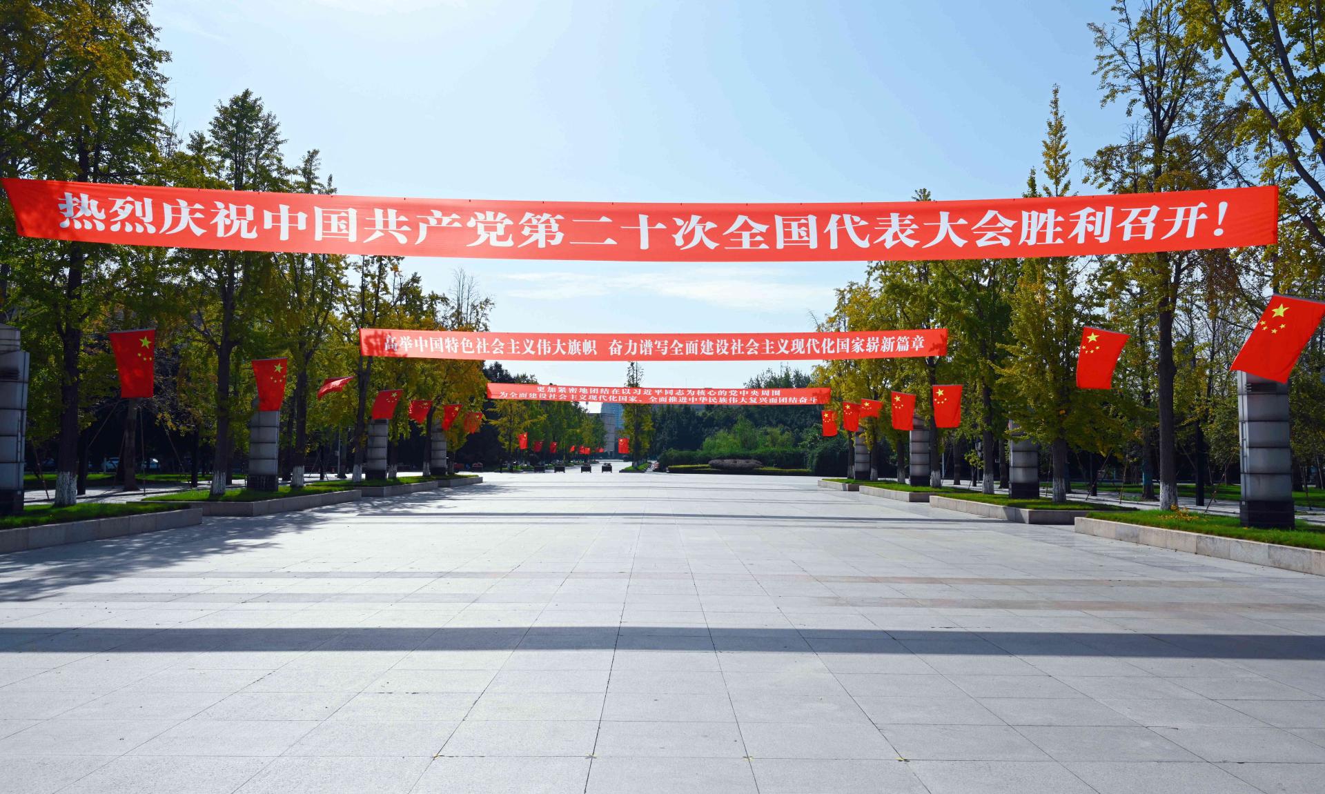 校园内排列整齐的五星红旗迎风招展,鲜艳横幅与蓝天绿树映照成画。“热烈庆祝中国共产党第二十次全国代表大会胜利召开”和“高举中国特色社会主义伟大旗帜,奋力谱写全面建设社会主义现代化国家崭新篇章”横幅在主会场内高高悬挂,党员徽章在党员干部师生胸前熠熠生辉。