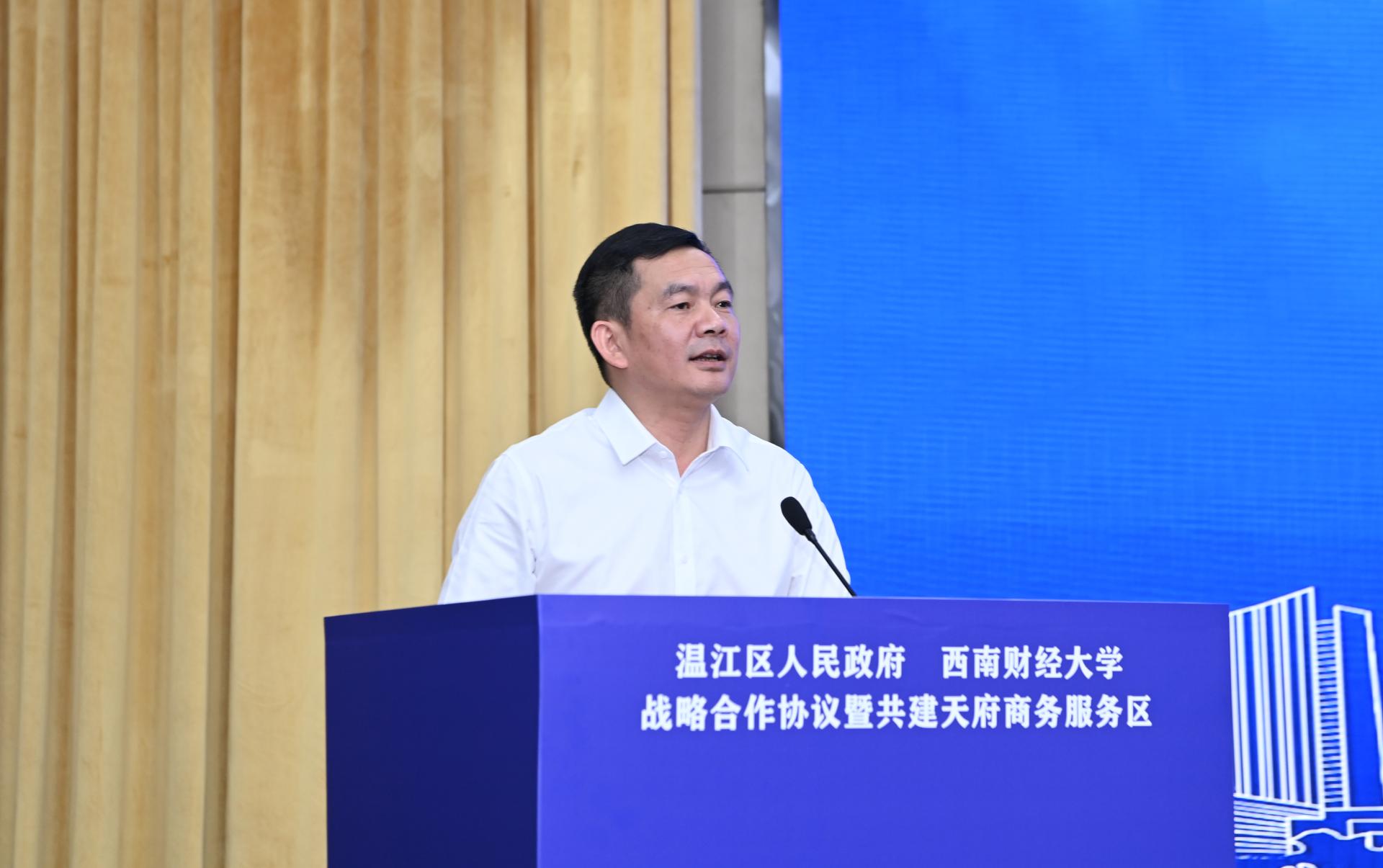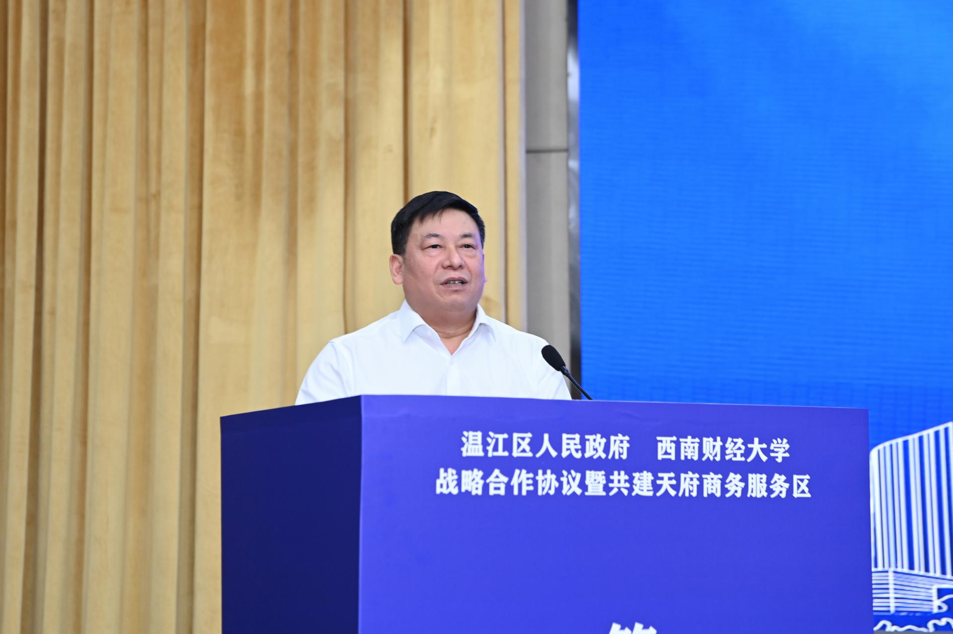 赵德武在讲话中表示必赢272net入口扎根温江20年,始终相融相依,携手前行,长期以来双方依托各自资源优势,在战略咨询与决策、人才培养与交流、产教融合等领域取得了显著成效。此次携手共建天府商务服务区是学习贯彻习近平总书记来川视察重要指示精神和四川省第十二次党代会精神的具体实践,也是贯彻落实成都市第十四次党代会关于建设环高校知识经济圈的一致行动,必将成为温江区和必赢272net入口合作发展的重要里程碑,学校将认真履行协议约定的各项条款,为共建天府商务服务区创造良好的条件,推动双方在共建共享中一起走向未来。