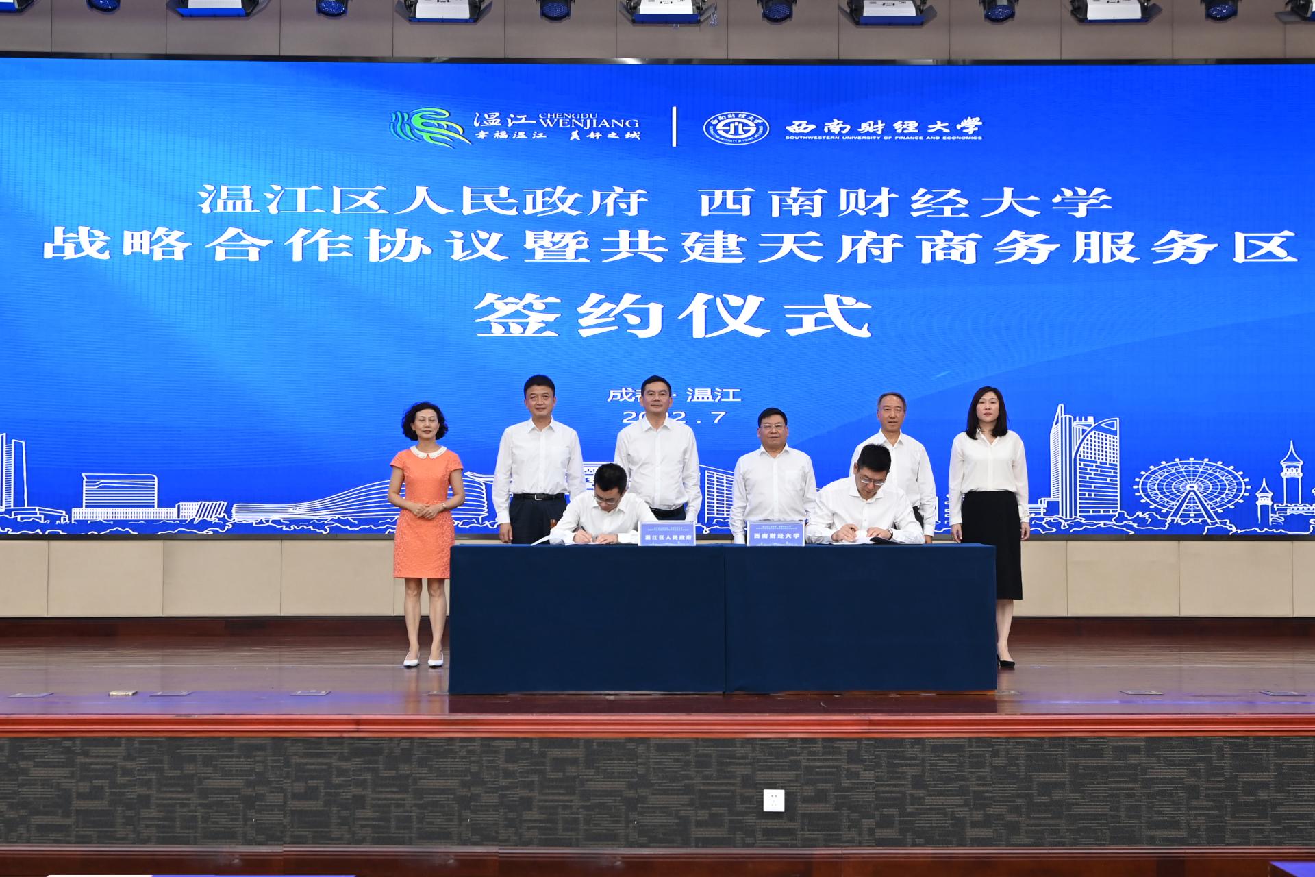 7月5日,必赢与温江区人民政府战略合作协议暨共建天府商务服务区签约仪式在温江区政府举行。温江区委书记王乾,区委副书记、区长马烈红,区政协主席蒋莉,区委常委、常务副区长刘拥军,区人大常委会副主任魏琳,副区长向彬;必赢党委书记赵德武,党委副书记、校长卓志,党委常委、副校长尹庆双出席签约仪式。
