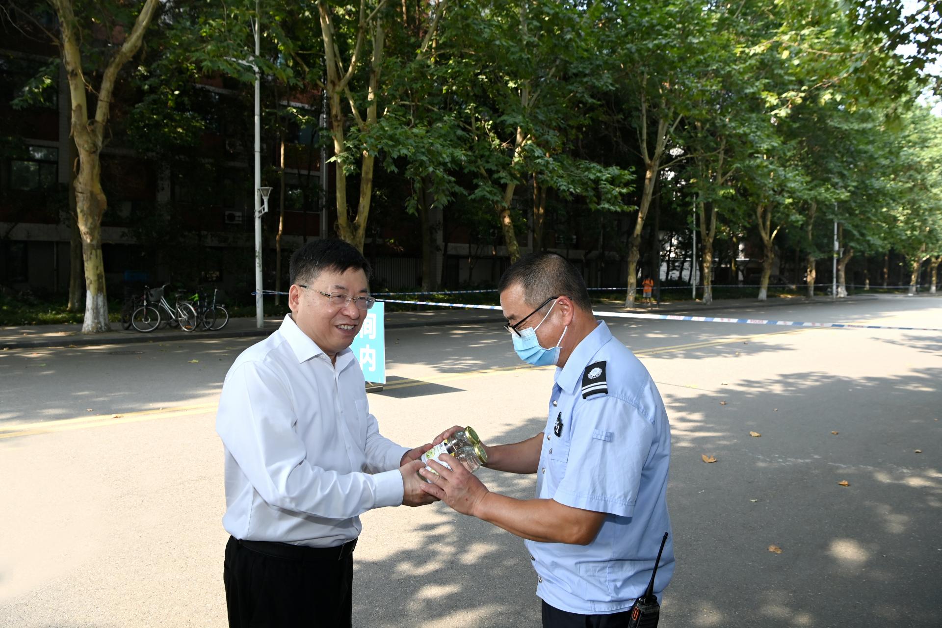 在学校各门卫值班岗亭和校医院,校领导一行详细了解了近日安全保卫和防疫工作情况,向在高温天气下坚守岗位、默默付出的工作人员表示诚挚慰问和感谢。他们指出,近期出现大范围持续高温天气,学校各单位要用心用情关爱一线工作人员,严格落实安全生产、防暑降温等工作措施。他们亲切叮嘱各位一线工作人员要注意防暑降温,并为大家逐一送上西瓜、金银花露、藿香正气水等解暑慰问品。