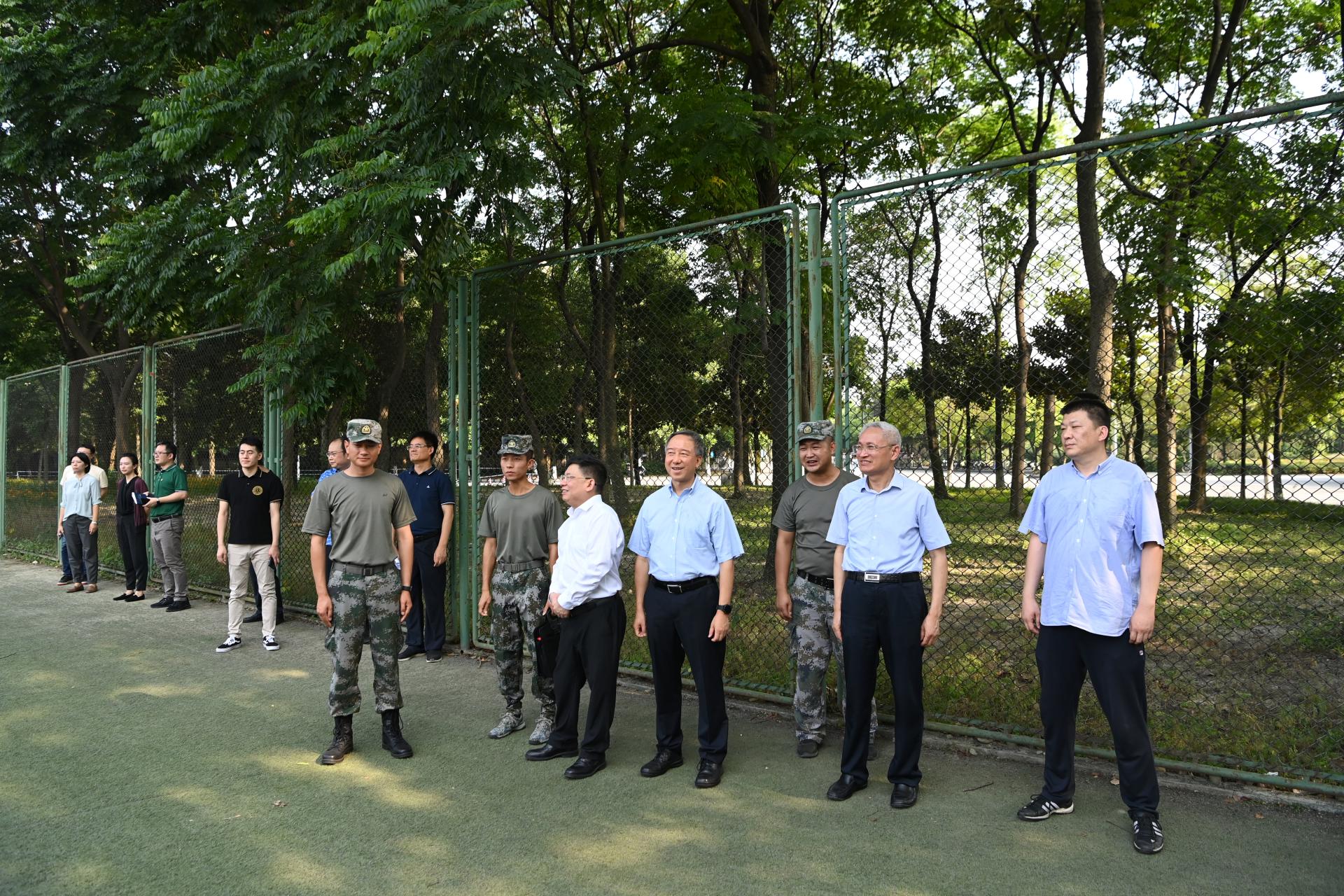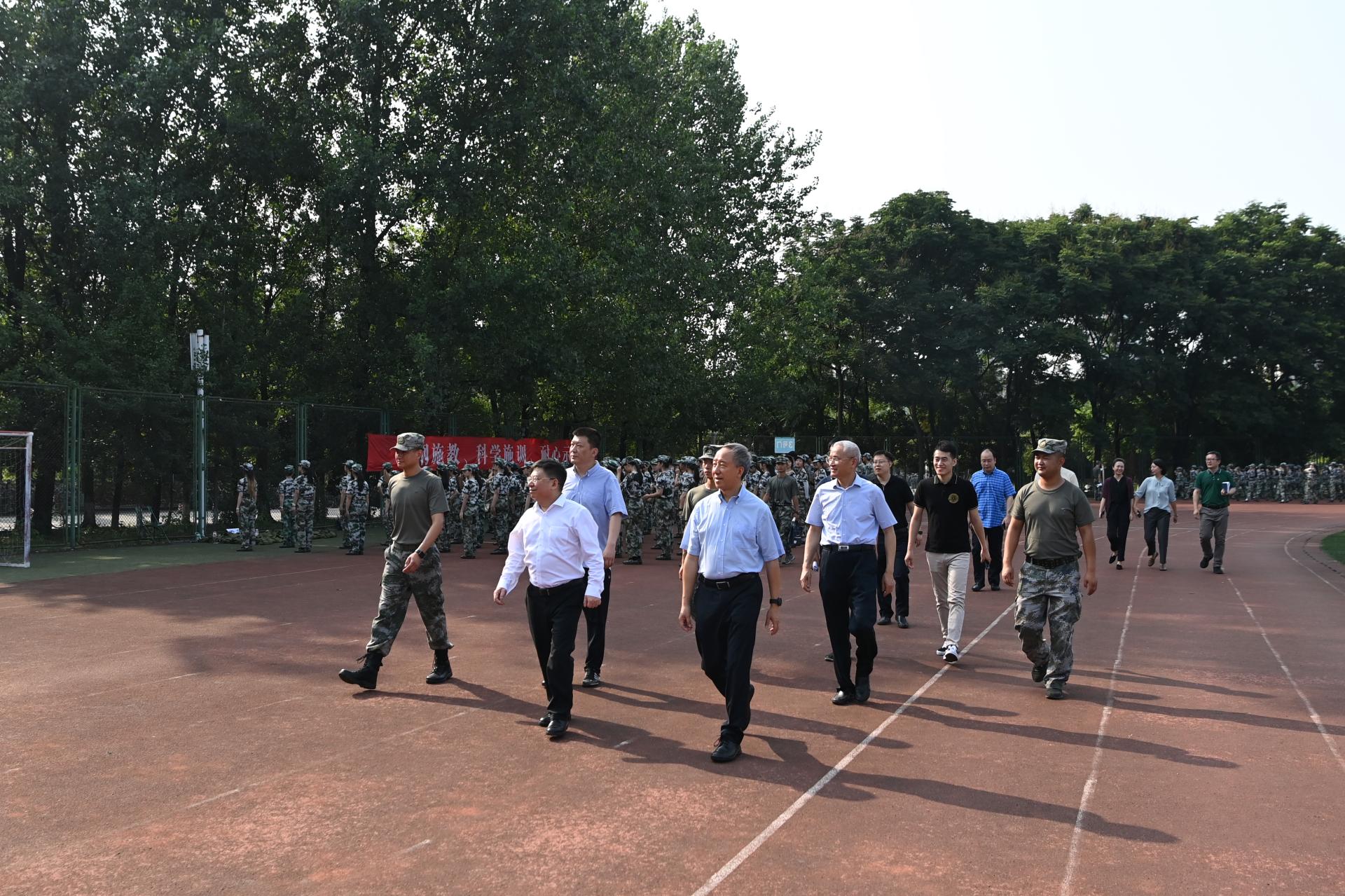 在2021级本科学生军训场地,校领导一行检查了军训工作,看望慰问参训学生、军训教官、带队辅导员及军训工作保障人员。他们对参训学生的训练精神和训练状态表示高度肯定,并对参训学生、教官和相关工作人员在高温天气下认真坚持训练、不折不扣完成军训任务表示亲切慰问。他们要求,各相关部门要做好疫情防控及后勤服务保障工作,确保军训任务圆满完成。