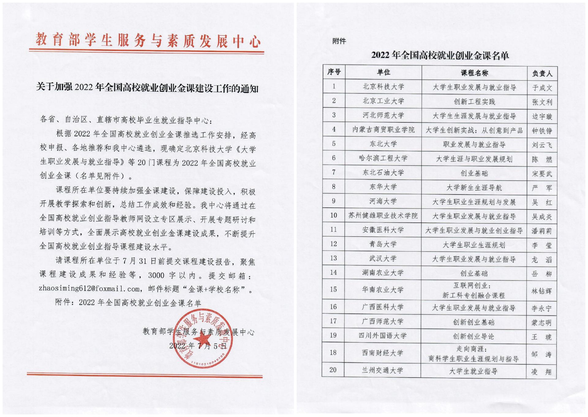 近日,教育部学生服务与素质发展中心下发《关于加强2022年全国高校就业创业金课建设工作的通知》,必赢《走向商涯:商科学生职业生涯规划与指导》课程被评为2022年全国高校就业创业金课。本次评选全国共20门课程入选,必赢是四川省唯一获评高校。