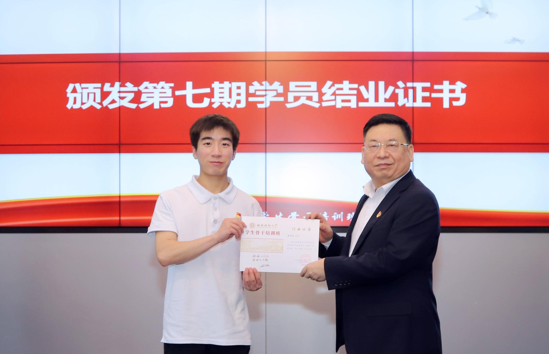 赵德武为第七期学员一一颁发结业证书并合影留念。他在与第七期学员的交谈中对学员们表达了充分肯定和殷切期望,勉励大家踔厉奋发、勇毅前进、追求卓越。他强调,希望学员们牢记“树雄心大志,当时代先锋”的班训,弘扬“经世济民,孜孜以求”的大学精神,不负韶华,不负时代,不负人民,努力成为德智体美劳全面发展、堪当民族复兴重任的时代新人。