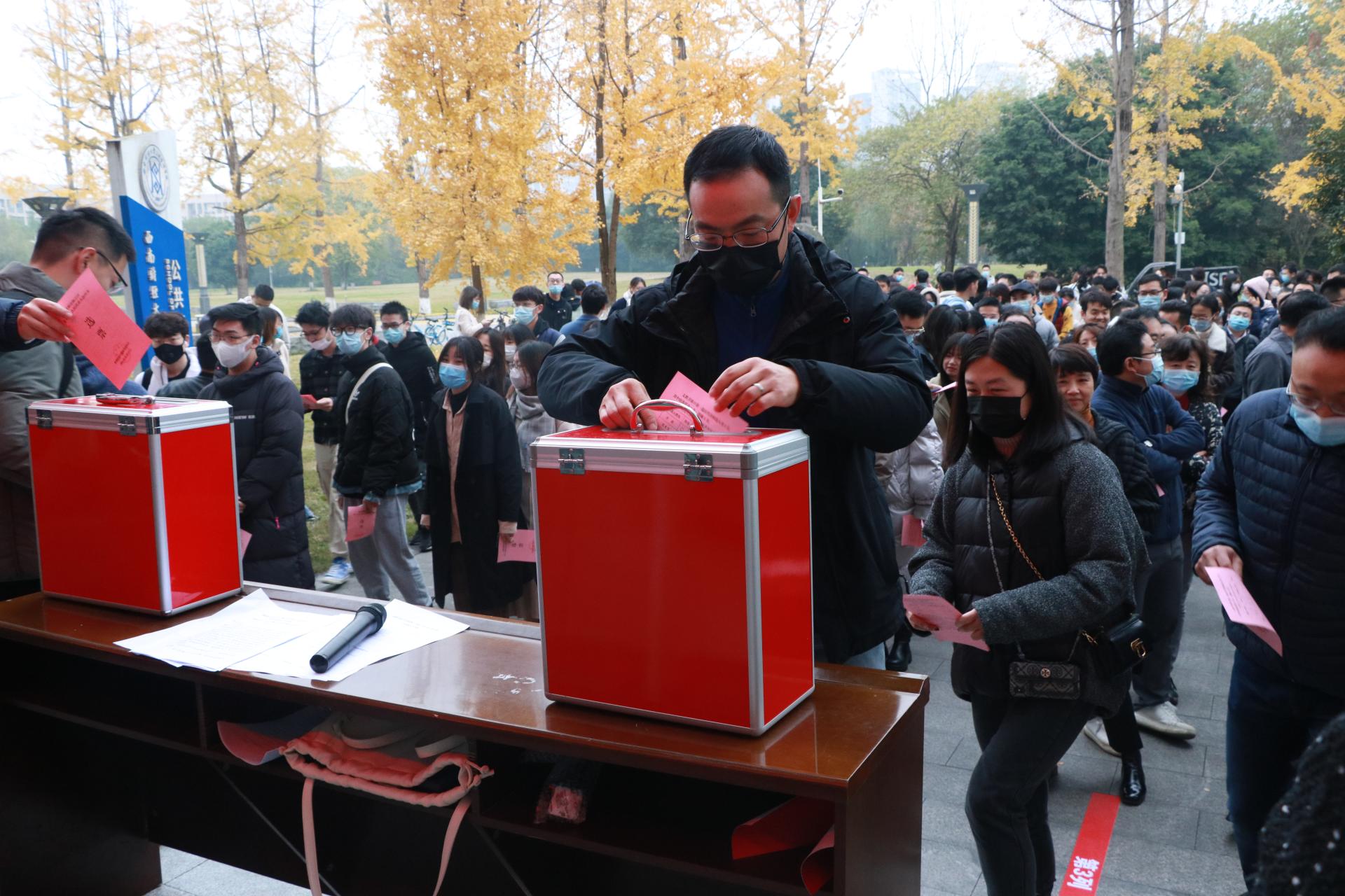 选举采取“分散投票、集中统票”方式进行,共设主会场1个、分会场23个,流动票箱1个,全校共4745名教职工和学生选民参加了投票。在各投票现场,红色票箱鲜艳夺目,现场氛围庄严而热烈。赵德武、卓志、曾道荣、欧兵、史代敏、张邦富、李永强等校领导在主会场参加了投票。师生们依次投票,行使法律赋予的民主权利,选举井然有序。投票环节结束后,各会场将选票密封,在总监票人、总计票人的监督指导下,各组当场验票并认真负责地进行了清点和统计。